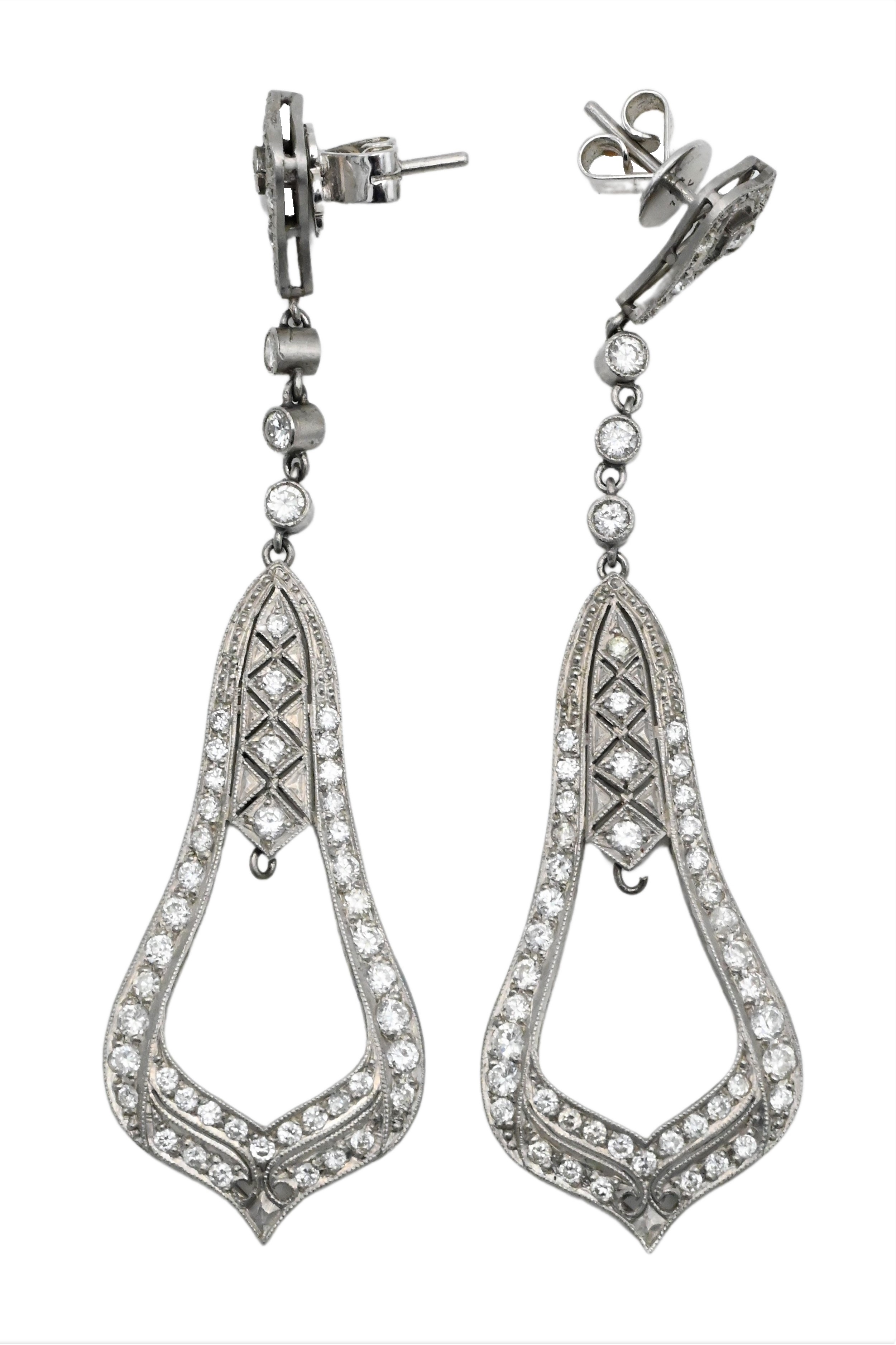 A Pair of 14 Karat White Gold Pierced Earrings, mounted with small diamonds, two small diamonds missing in each and diamond drop missing in center, 9.8 grams.