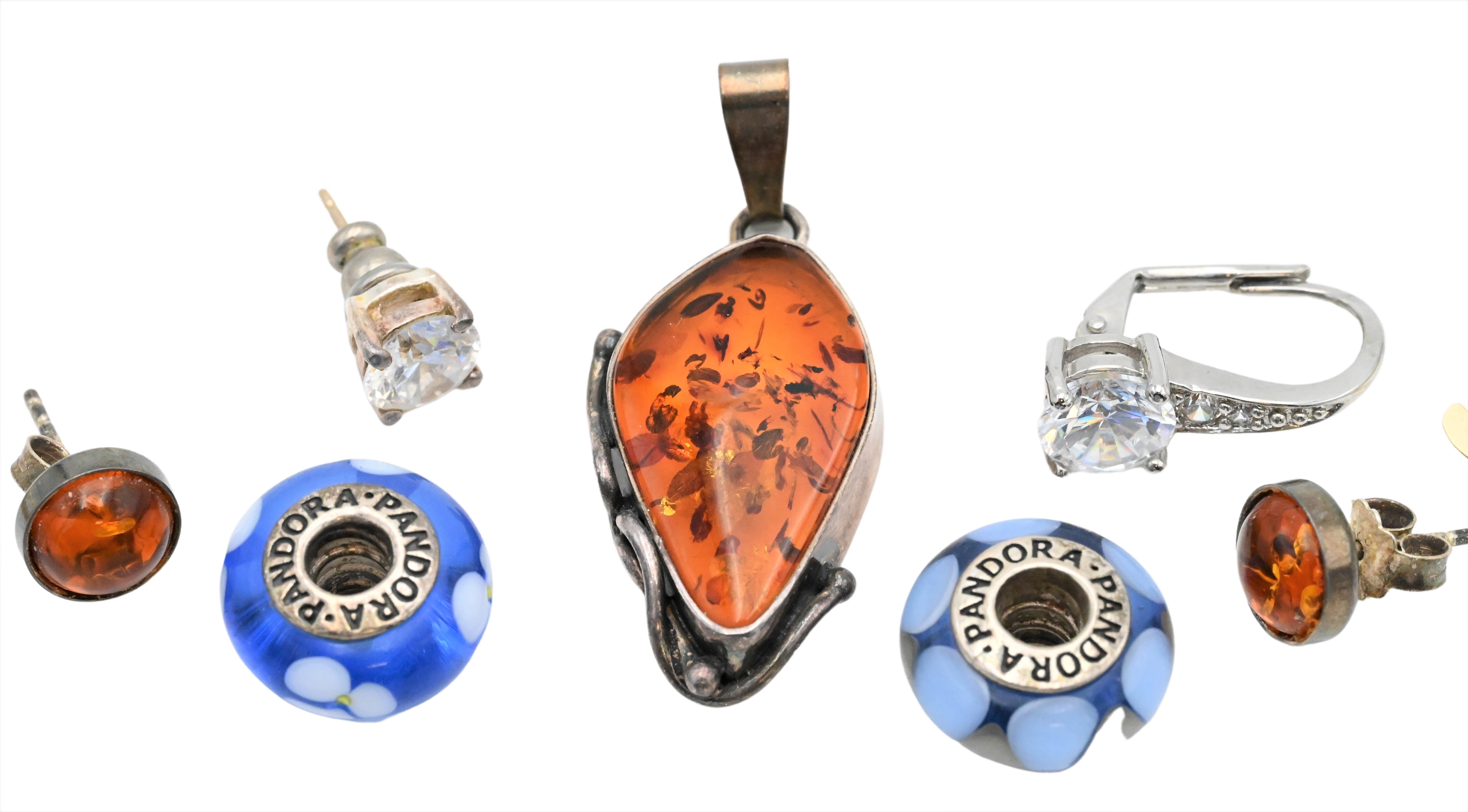 Lot of Miscellaneous Gold, to include an amber pendant and earrings, along with gold chains, along with two Pandora pieces.