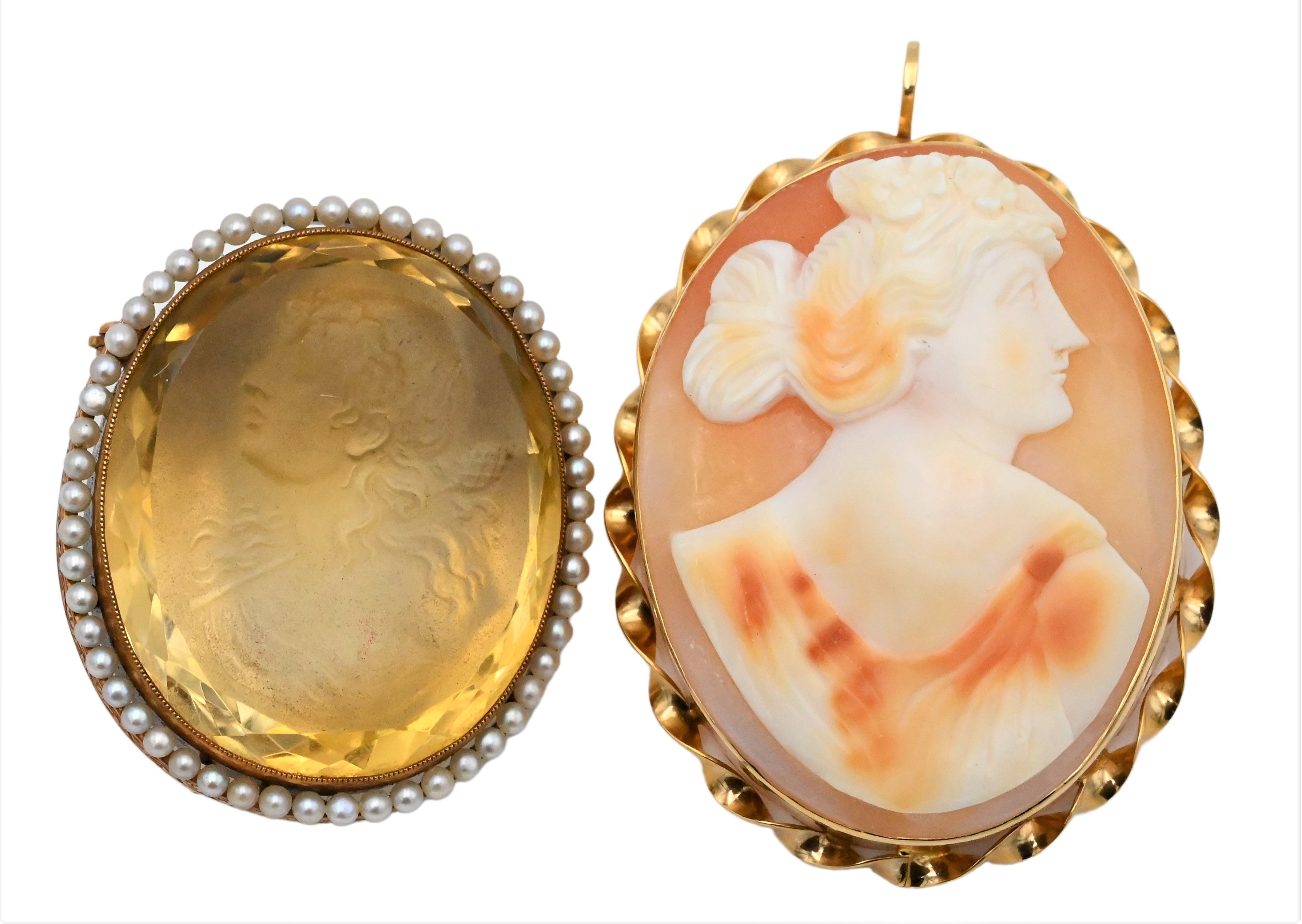 Two Gold Framed Cameos, to include one shell cameo, along with one amber color.