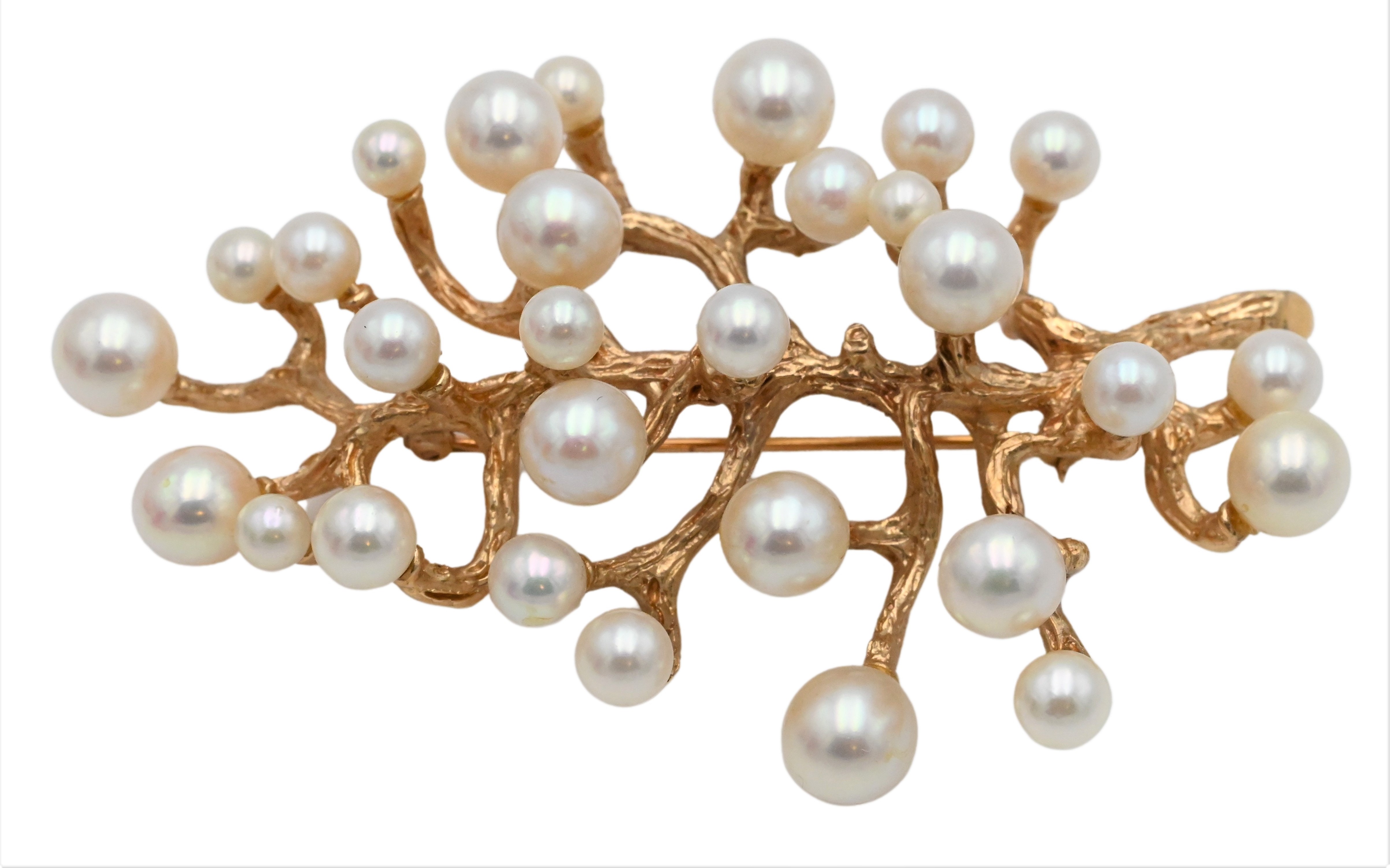 14 Karat Yellow Gold Brooch Tree, having pearl ends, height three inches, 27 grams total weight.