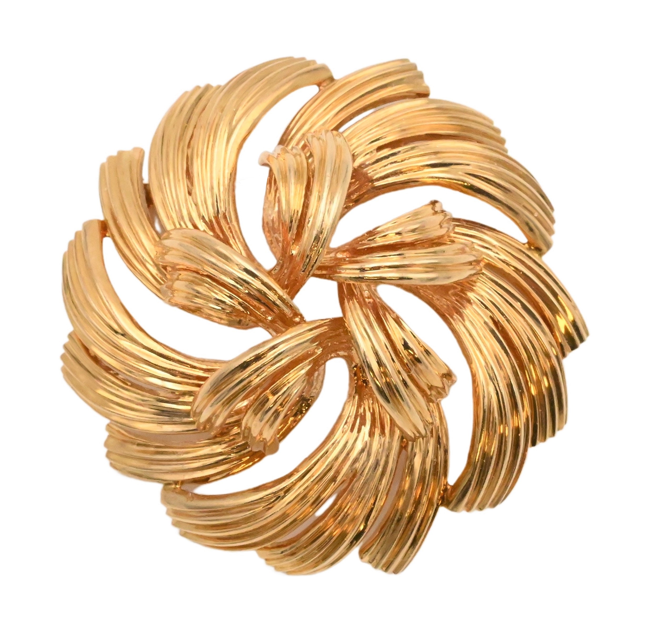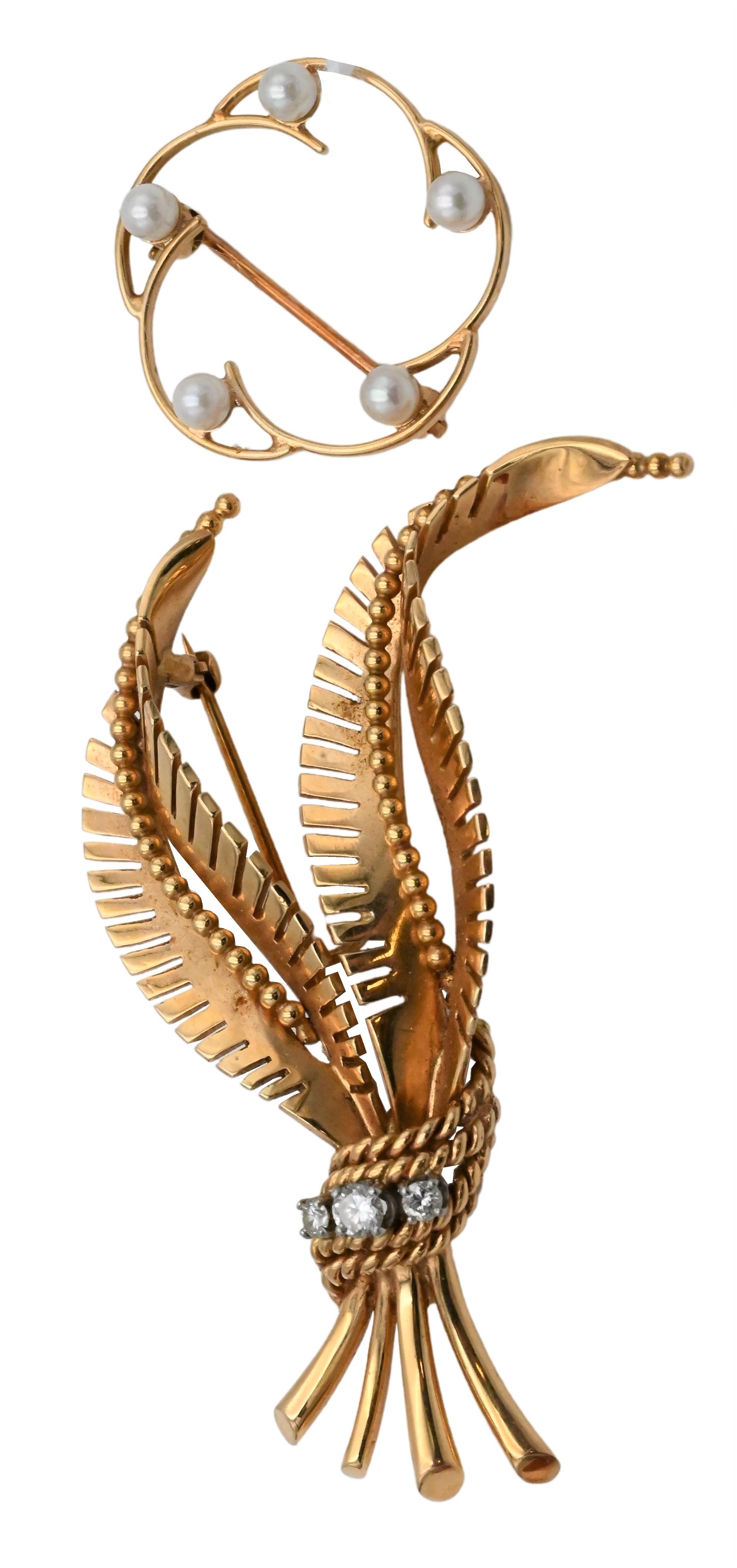 Two 14 Karat Yellow Gold Brooches, to include one with ferns and three diamonds, 10.9 grams.