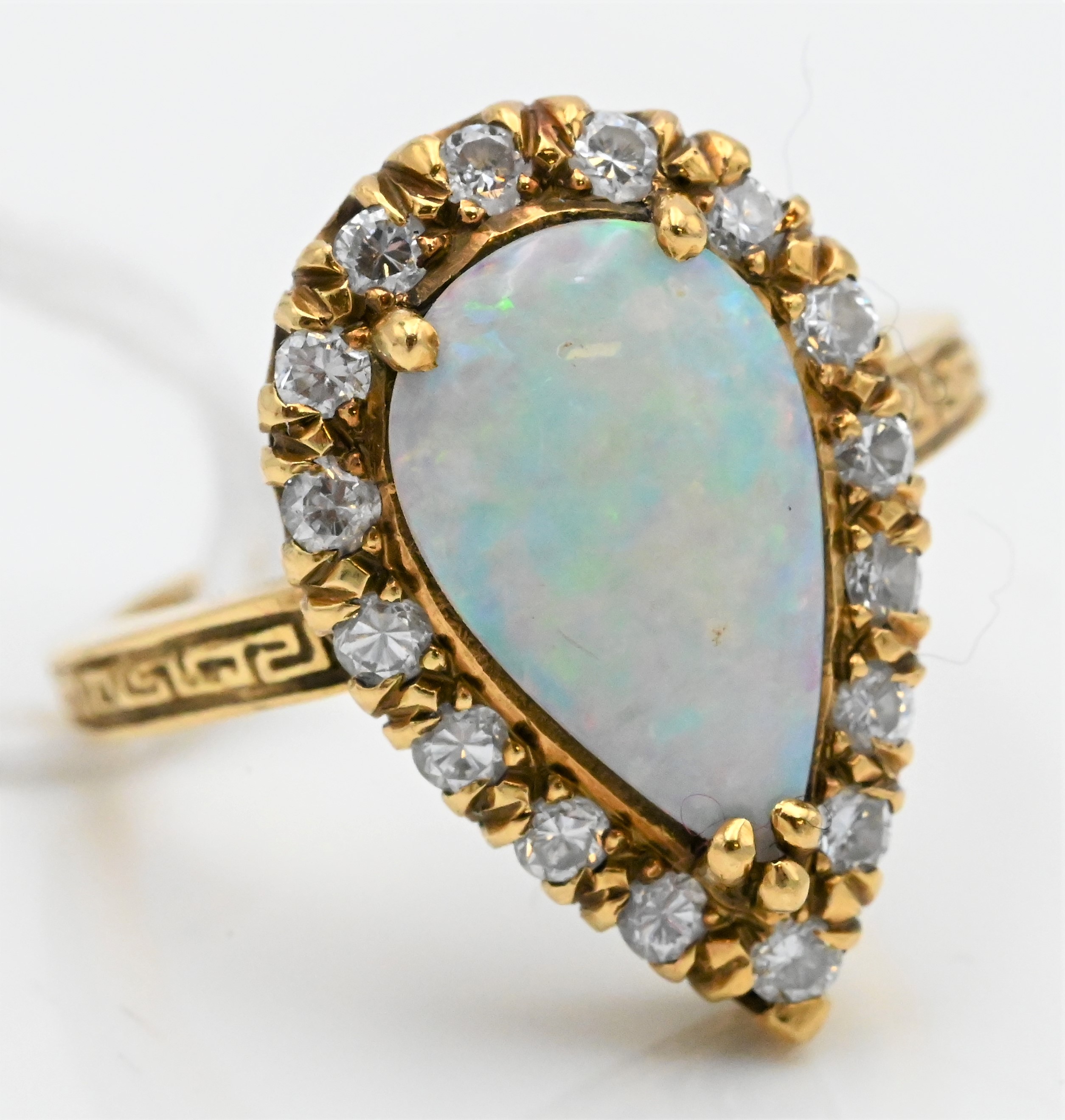 18 Karat Yellow Gold Ring, having pear shaped opal, surrounded by diamonds, size 5, 3/4 inches.