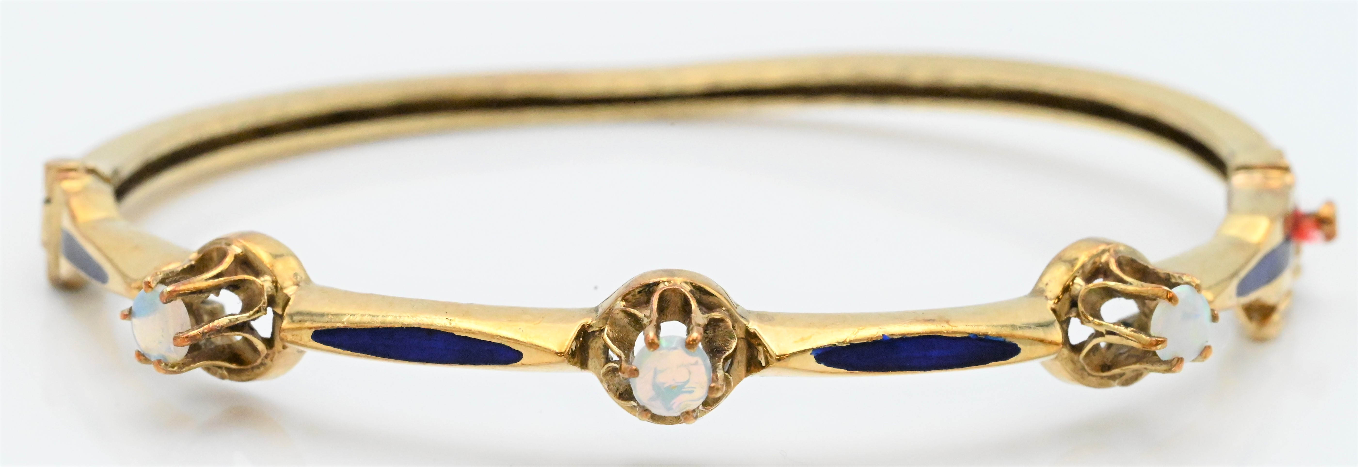 14 Karat Yellow Gold Bangle Bracelets, to include one mounted with three opals, along with one mounted with two opals, total weight 33 grams.