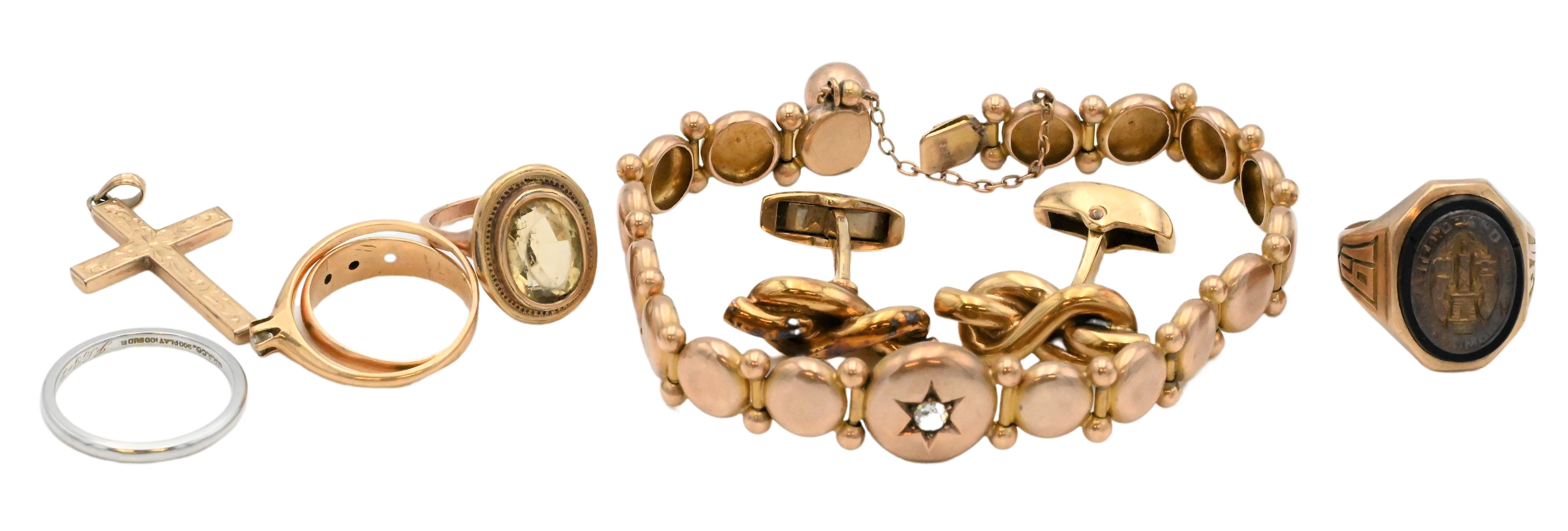 Nine Piece Gold Lot, to include a bracelet having a small diamond, a pair of Garrard cufflinks, a cross pendant, align with five rings, one white gold, 41.2 grams.