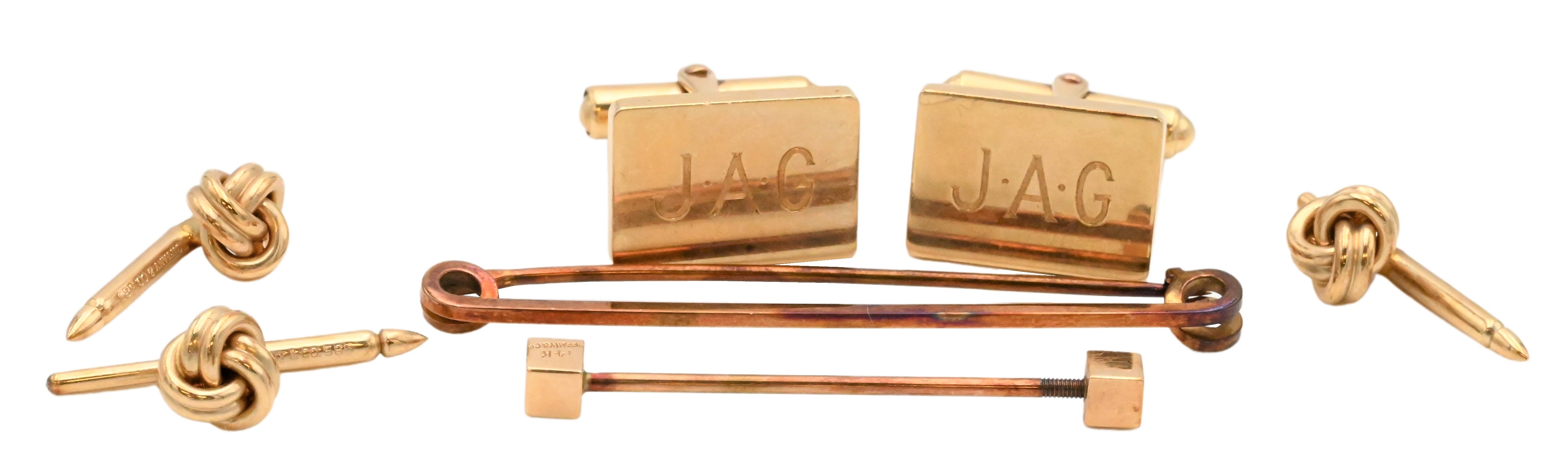 Tiffany & Company 14 Karat Gold Lot, to include cufflinks, three buttons, safety pin and collar tie, 30.6 grams.