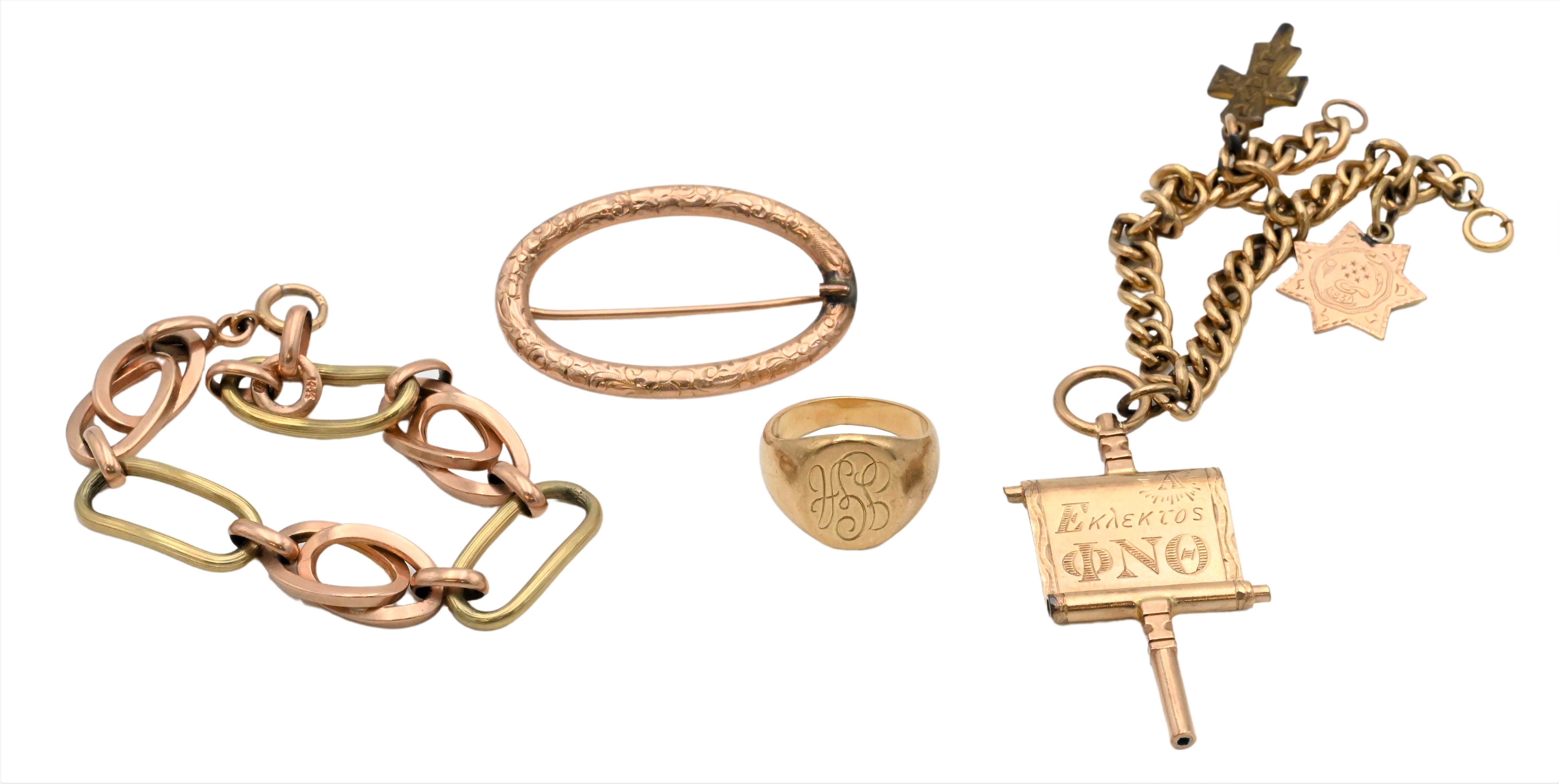 14 Karat Gold Lot, to include two bracelets, a pin, and ring, 37.6 grams.