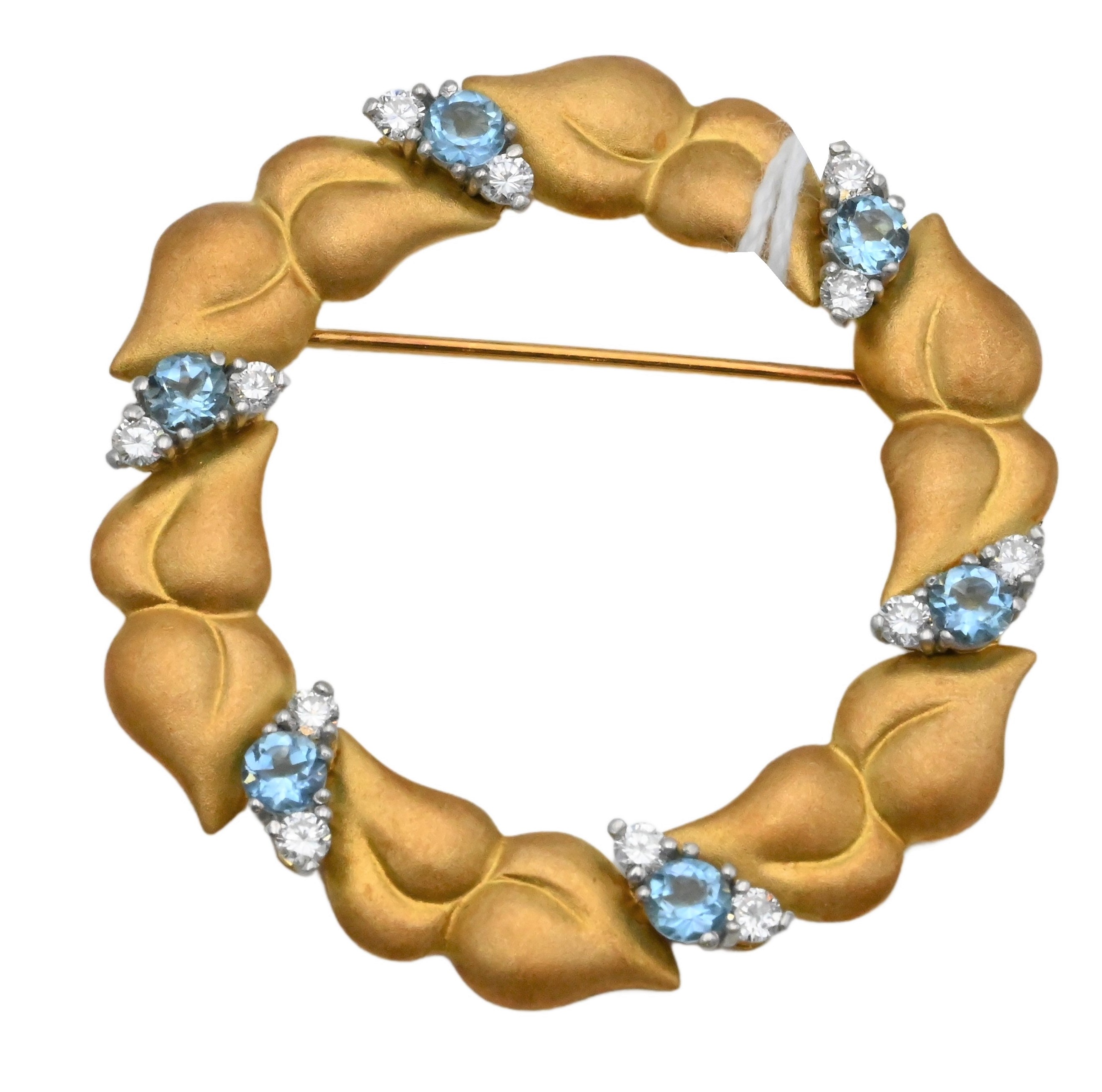 18 Karat Yellow Gold Wreath Brooch, set with diamonds and blue stones, 10.7 grams.