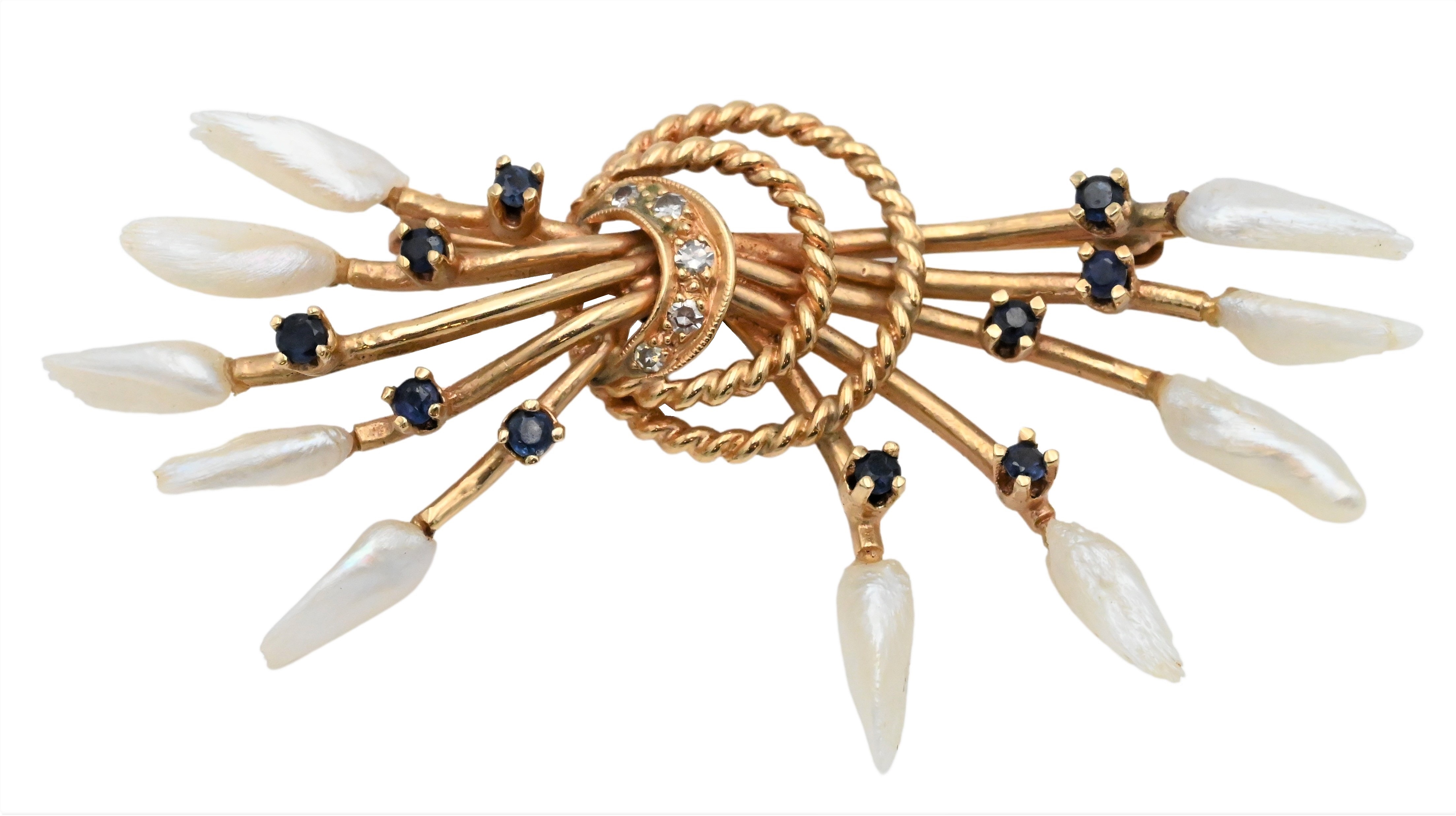 14 Karat Yellow Gold Brooch, having pearls, diamonds, blue stones, 9.2 grams.