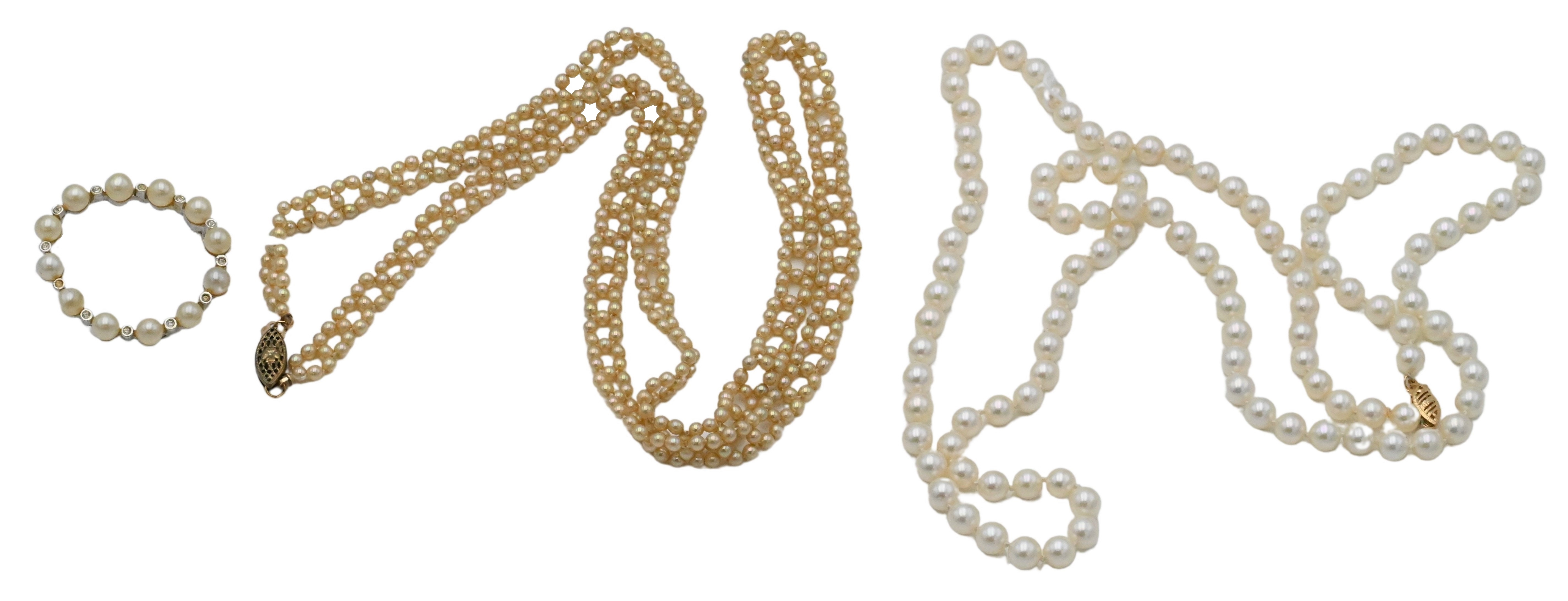 Three Piece Pearl Single Strand Necklace, having 14 karat clasp along with pin and costume pearls.