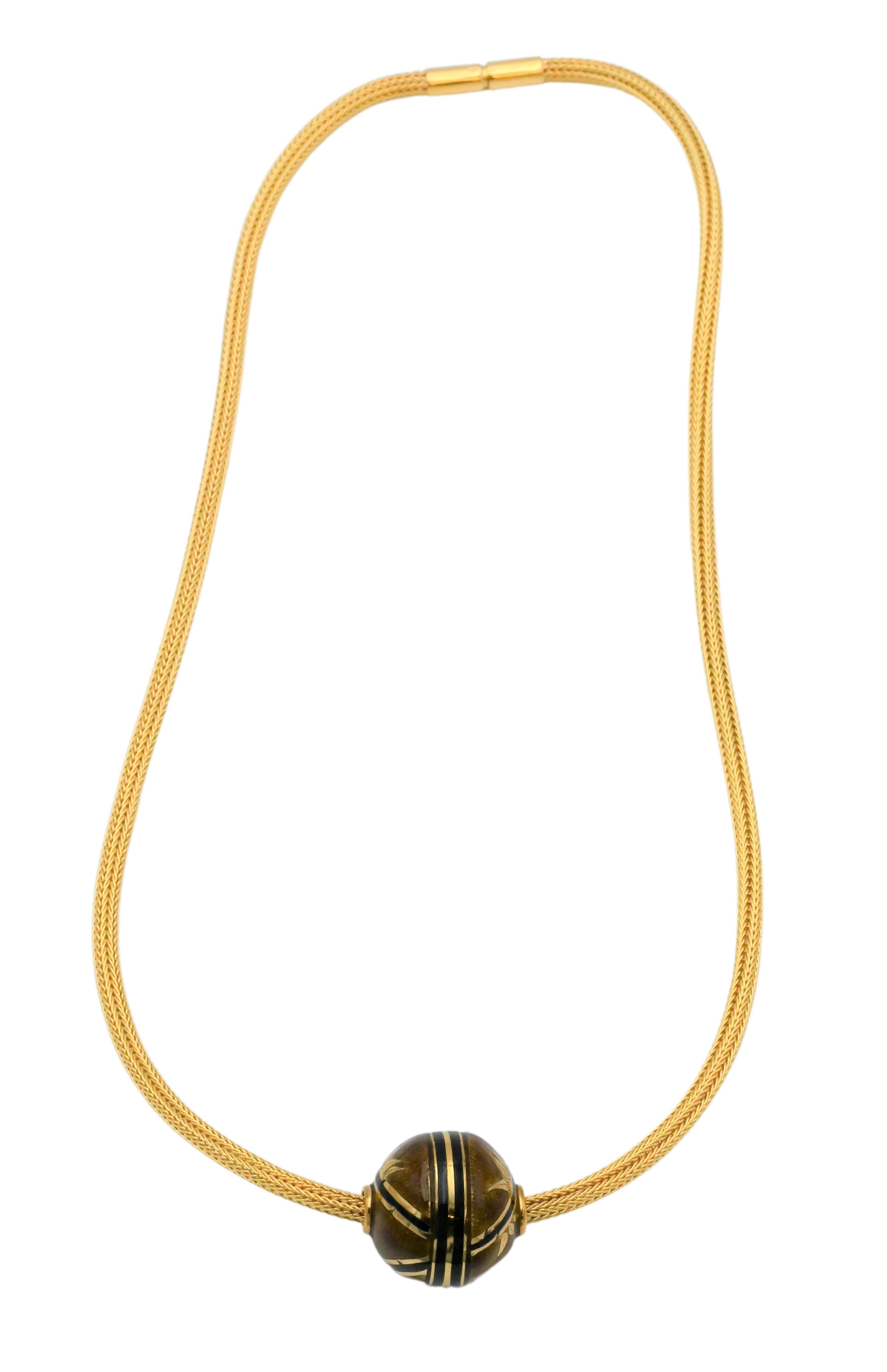 18 Karat Yellow Gold Mesh Necklace, having enameled ball pendant, length 19 inches, 43.5 grams total weight.