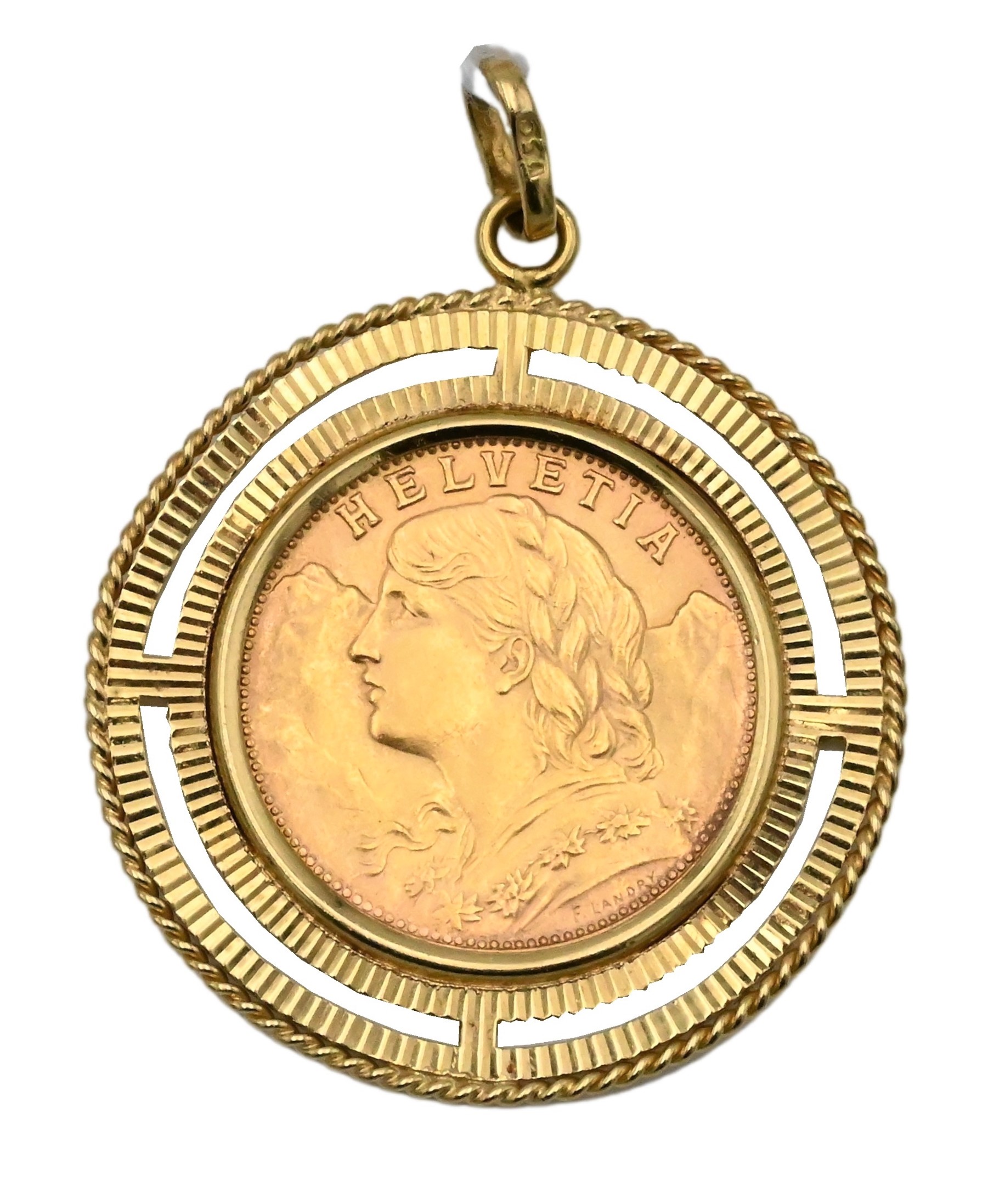 20 Franc Gold Coin in 18 Karat Gold Pendant Holder, 11 grams.