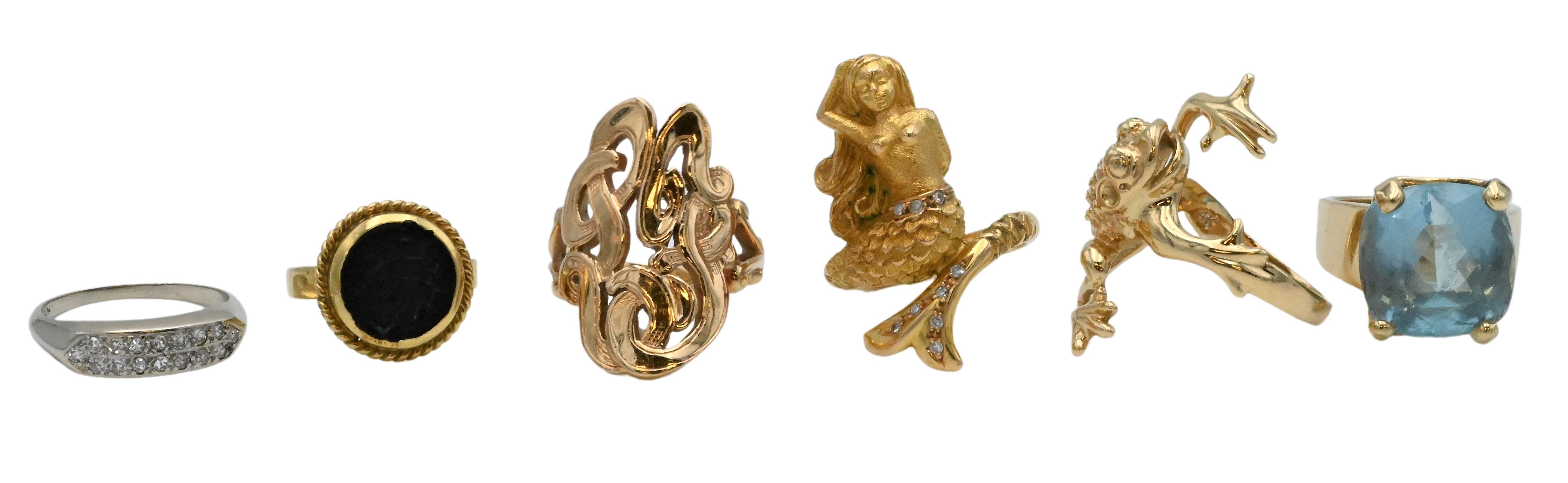 Six Piece 14 Karat Yellow Gold Rings, to include one with blue stone, one frog fern, one with small diamonds. 45.2 grams.