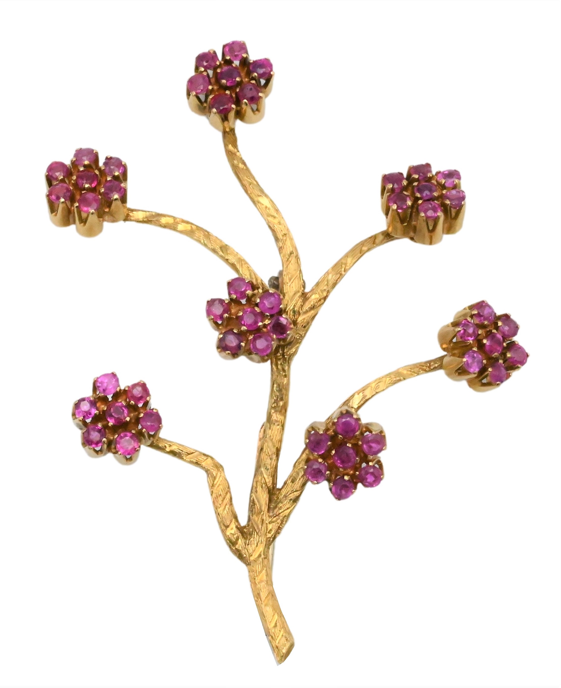 18 Karat Yellow Gold Treeform Brooch, having revolving red stones, 9.1 grams.