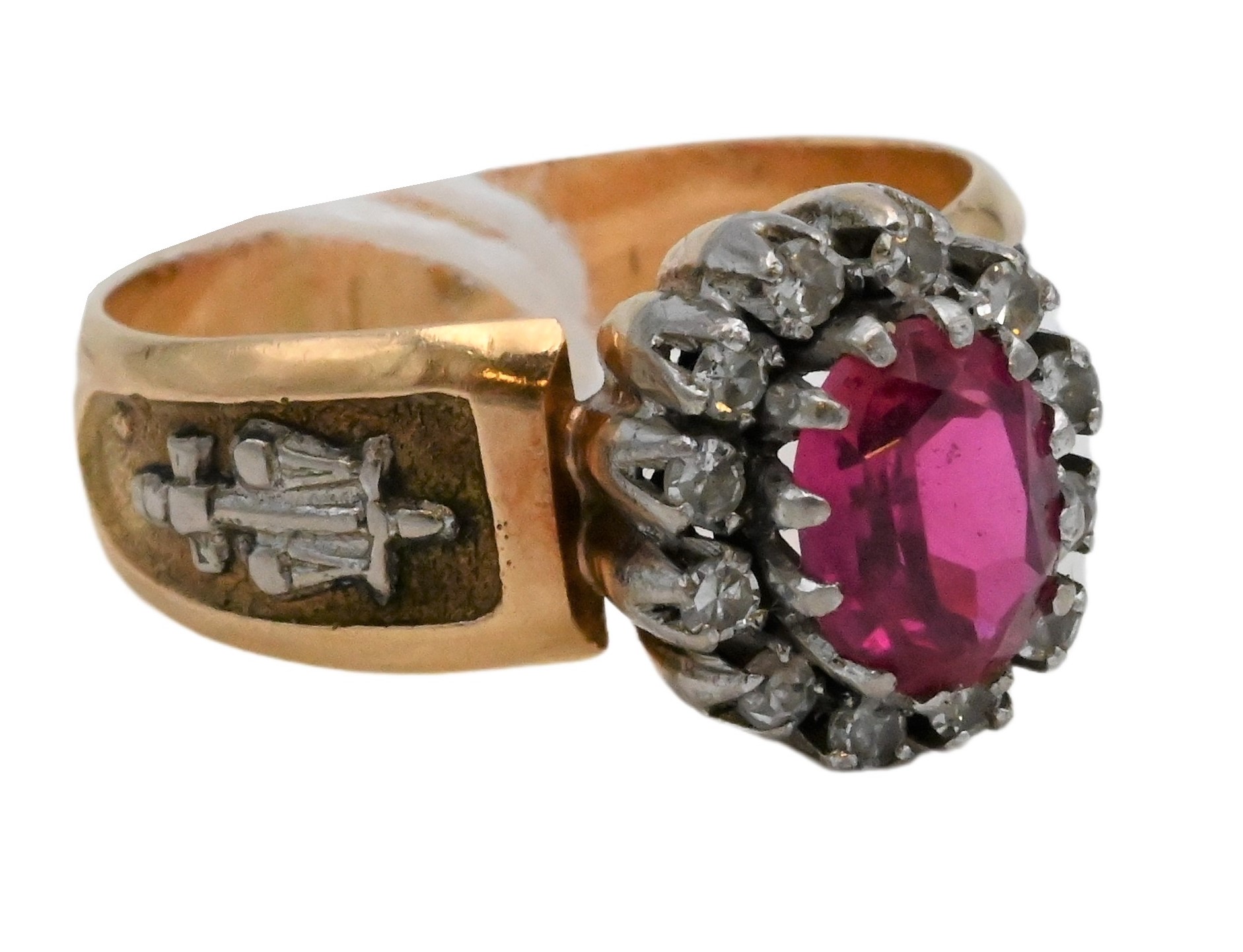 14 Karat Yellow Gold Ring, set with oval pink sapphire and diamond surround, size 11, 9.1 grams total weight.
