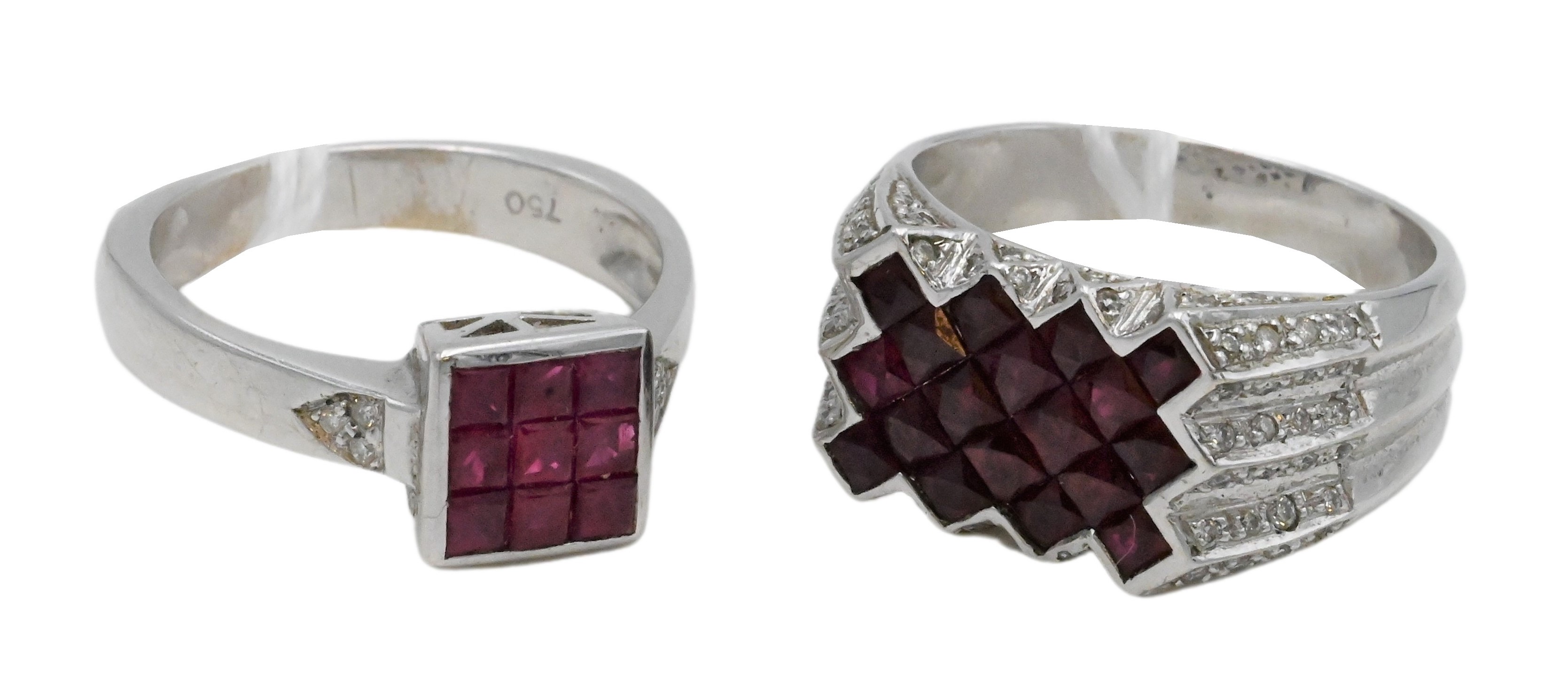 Two 18 Karat White Gold Rings, each set with red stones and small diamonds, both size 7, 12.8 grams total weight.