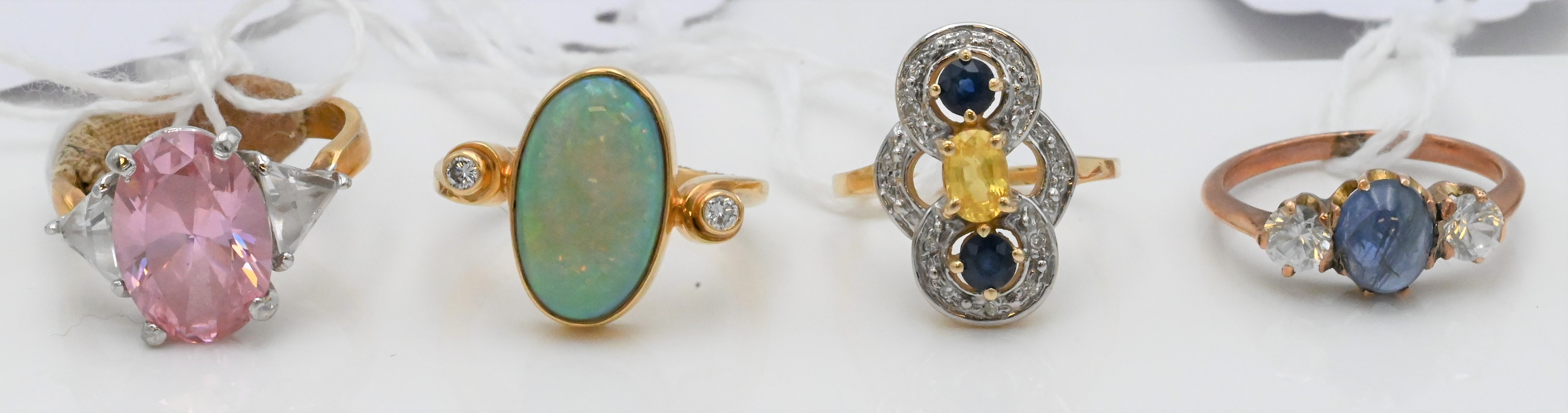 Lot of Four Gold Rings, one marked 14 karat, 18 karat, set with various stones, pink 5 3/4, blue diamond 7 1/4, opal 7, 3 stone, 6 1/2, 17.6 grams.