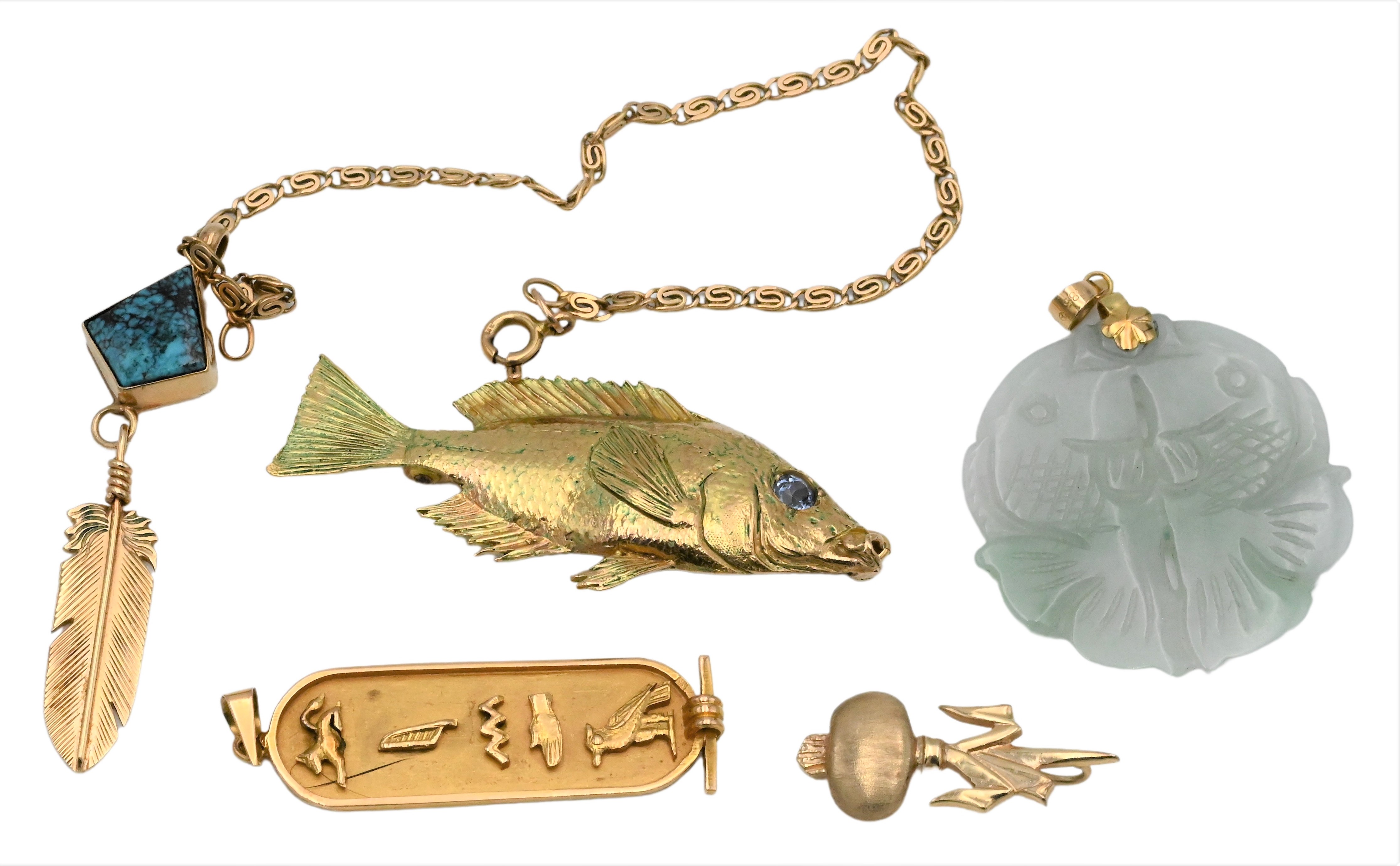 Group of 14 Karat Yellow Gold Jewelry, to include Egyptian pendant, bracelet, feather pendant set with turquoise, and flower shaped pendant, gold fish pendant/brooch set with stone eye and a yellow gold Jade pendant, .