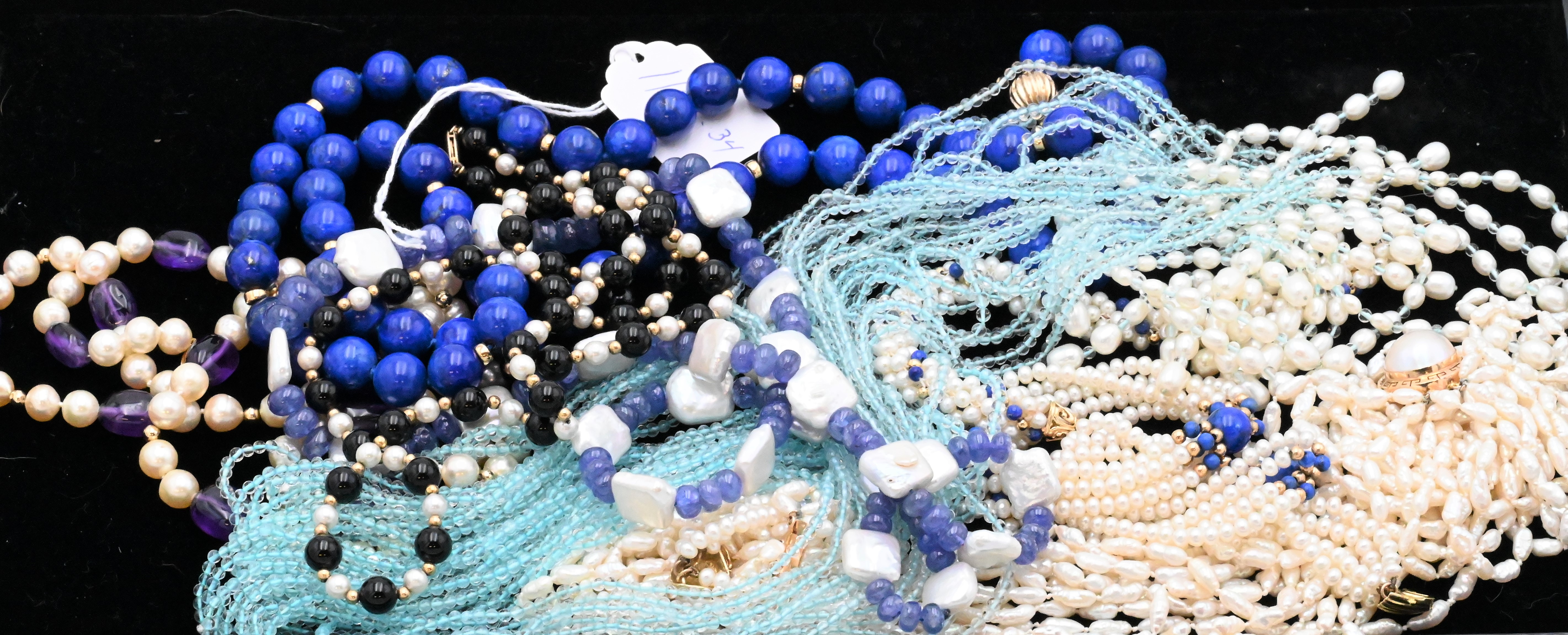 Eight Piece Lot, to include six necklaces, some having gold clasps, some having gold beads, a pearl and lapis bracelet set with gold clasp, along with one wrap around having aqua colored small beads.