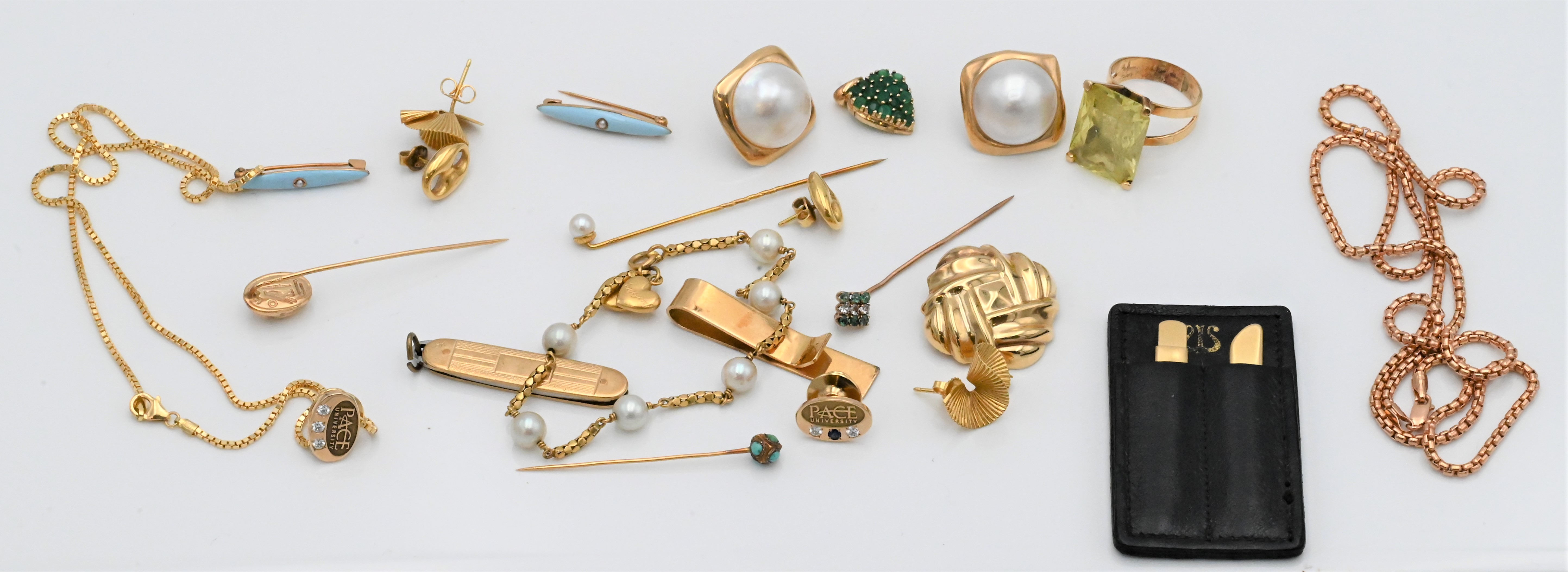 Group Lot of Mostly Gold, to include bracelet, rings, pins, earrings, ring settings, gold filling, 65 grams total weight.