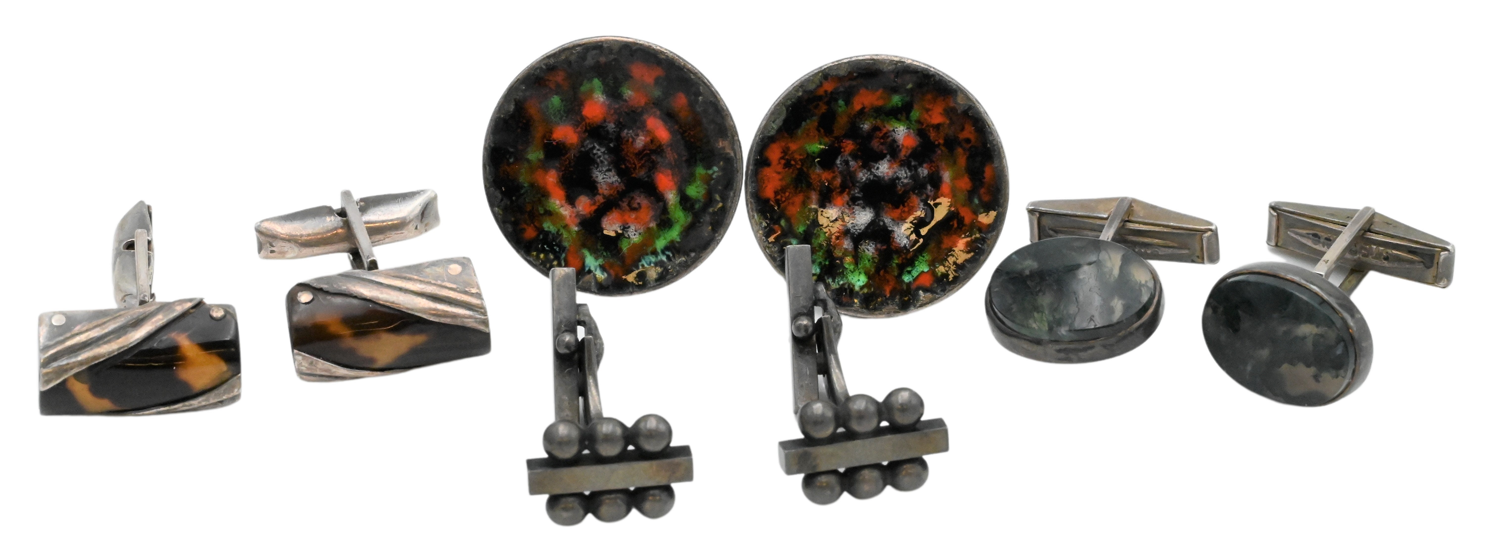 Four Pairs of Sterling Silver Cufflinks, to include one pair marked Georg Jensen, one William Pratling, one enameled with crossed swords, cufflink has mounted tortoise shell, one pair mounted with agate.