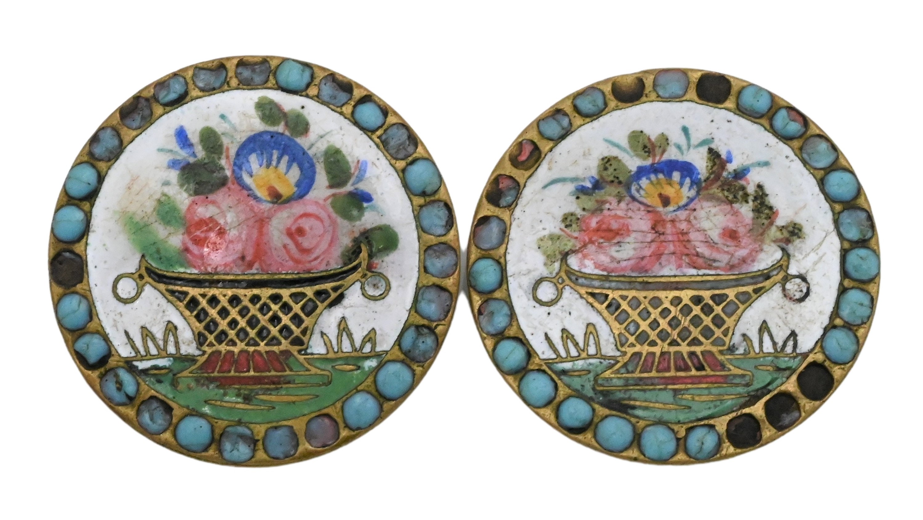 A Pair of Large Enameled Buttons, having basket of flowers and turquoise color surround, diameter 1 1/8 inches, 18th – 19th century.