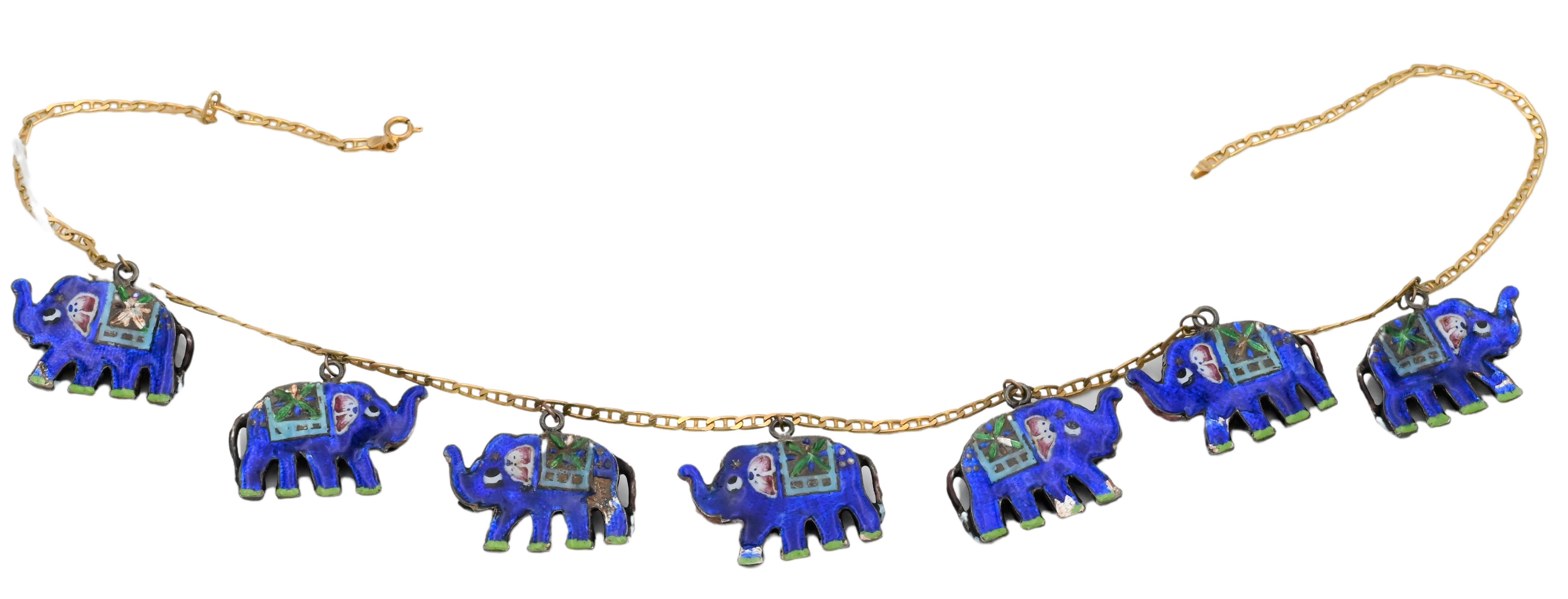 14 Karat Yellow Gold Chain, having seven enameled elephants, each mounted with red stone, length 19 inches.