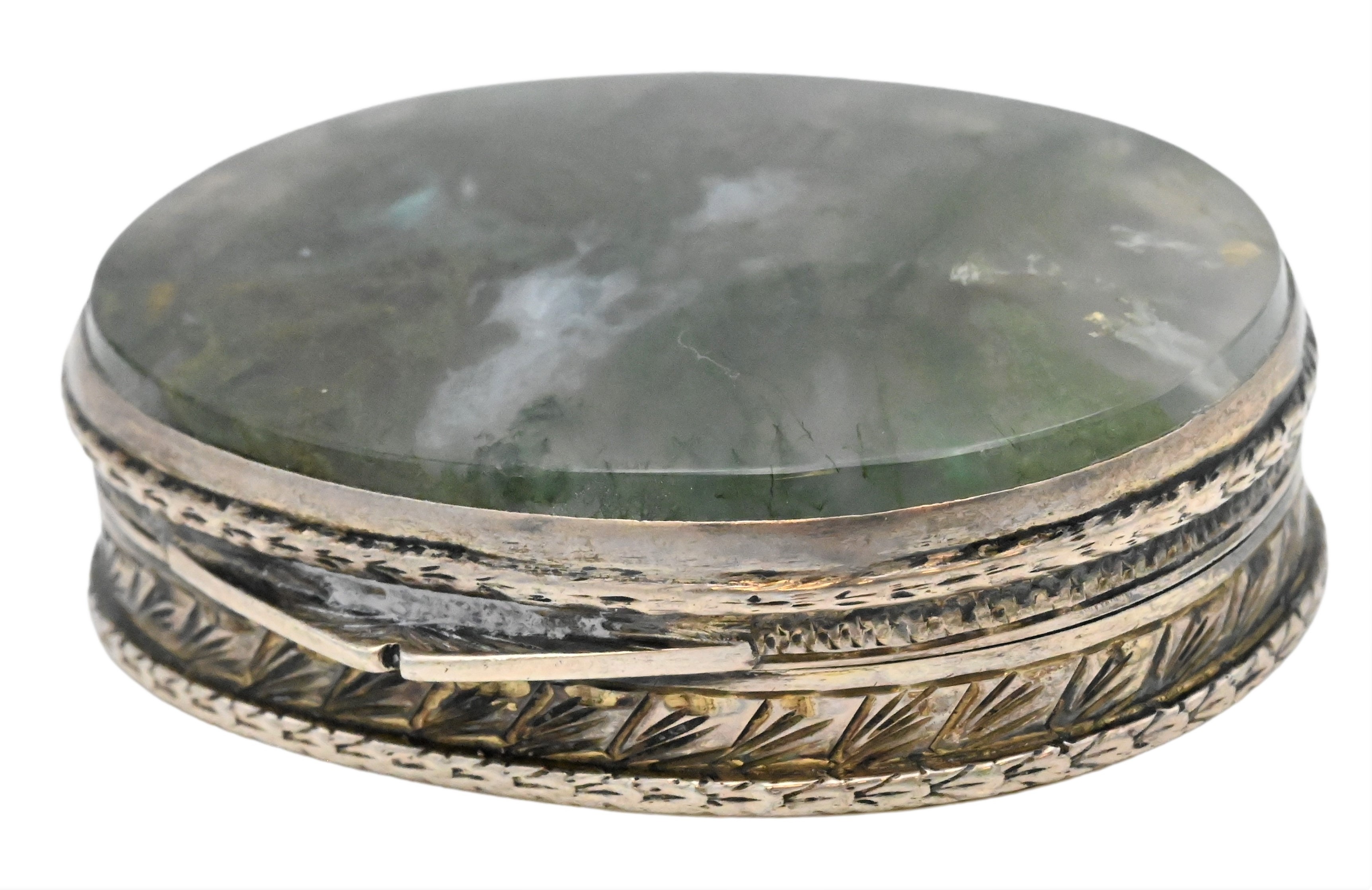 Silver Oval Box, having agate cover, 1 1/2″ x 1 7/8″.