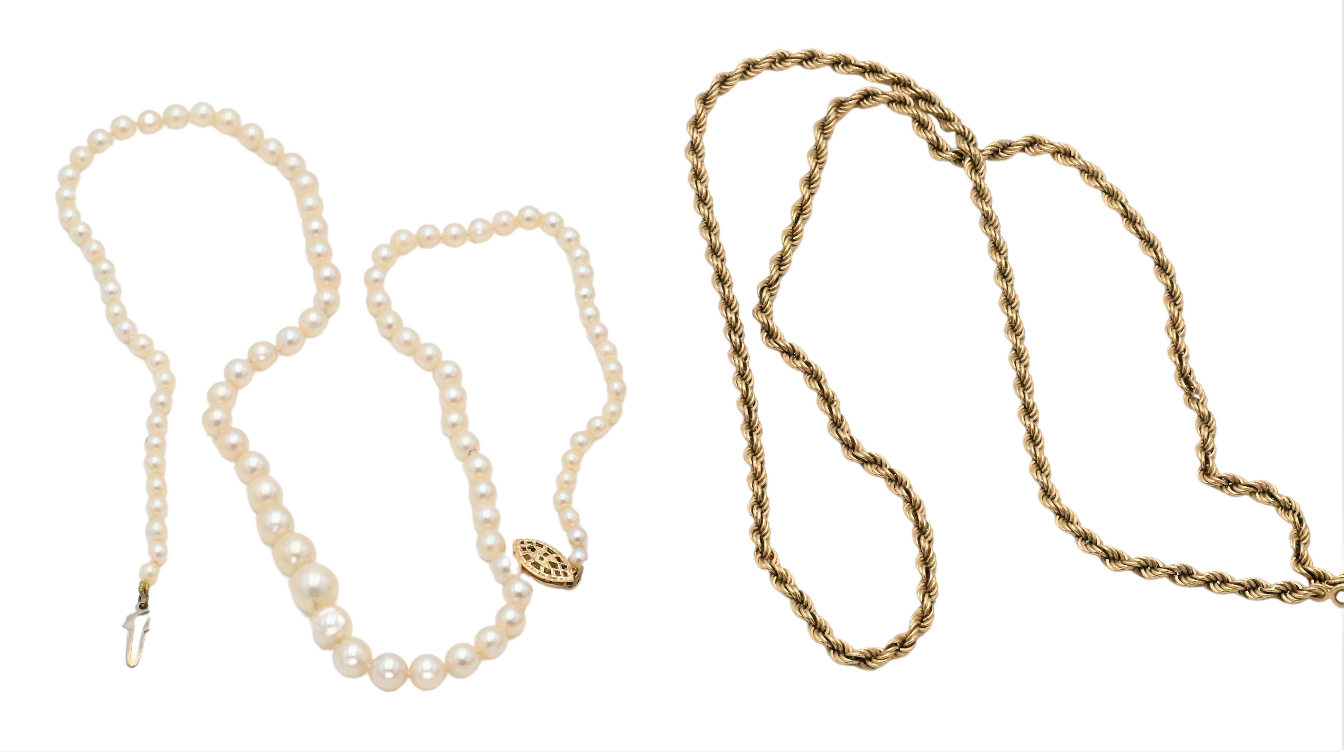 Two Piece 14 Karat Yellow Gold Rope Chain, length 24 inches, along with pearl necklace, 26.9 grams.