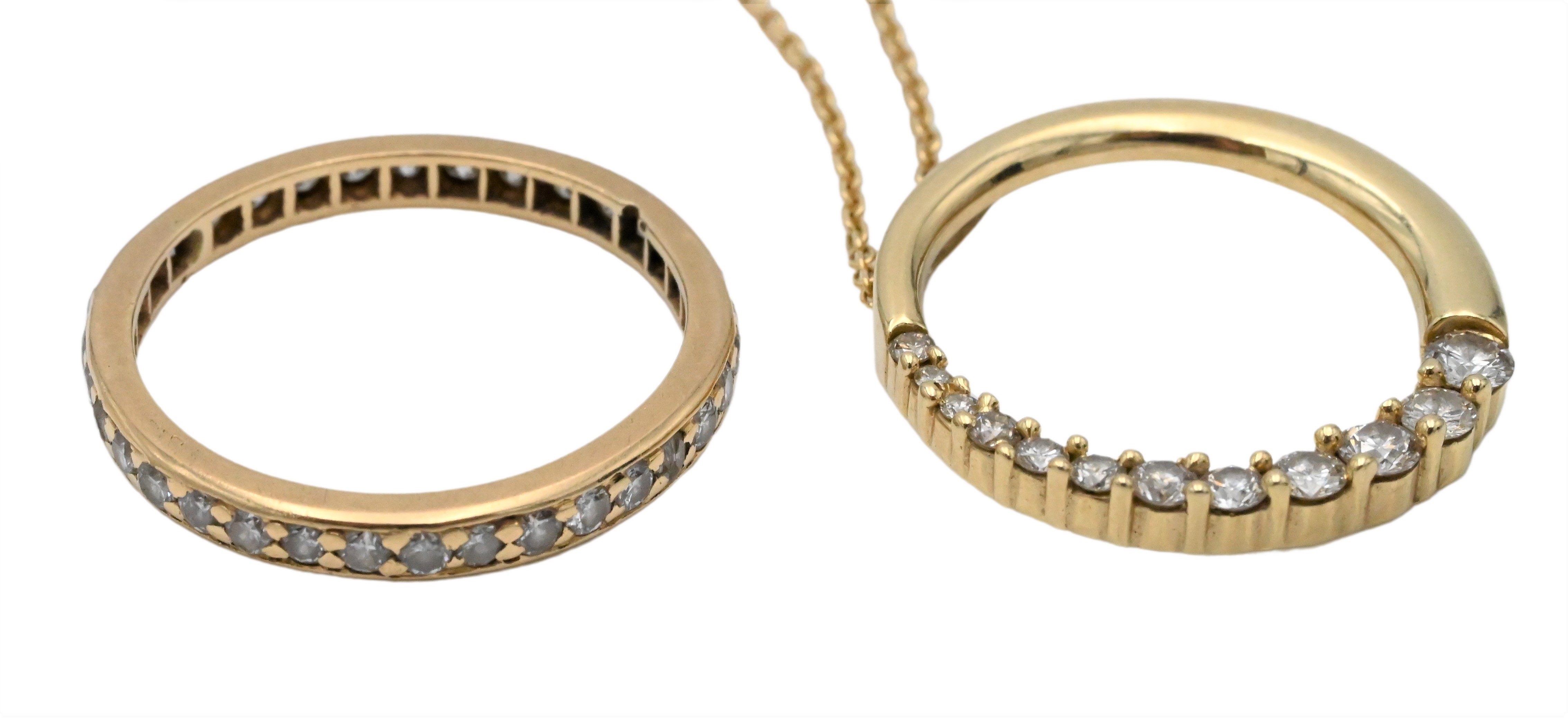 14 Karat Yellow Gold Chain, having round pendant with diamonds and channel set diamond ring.