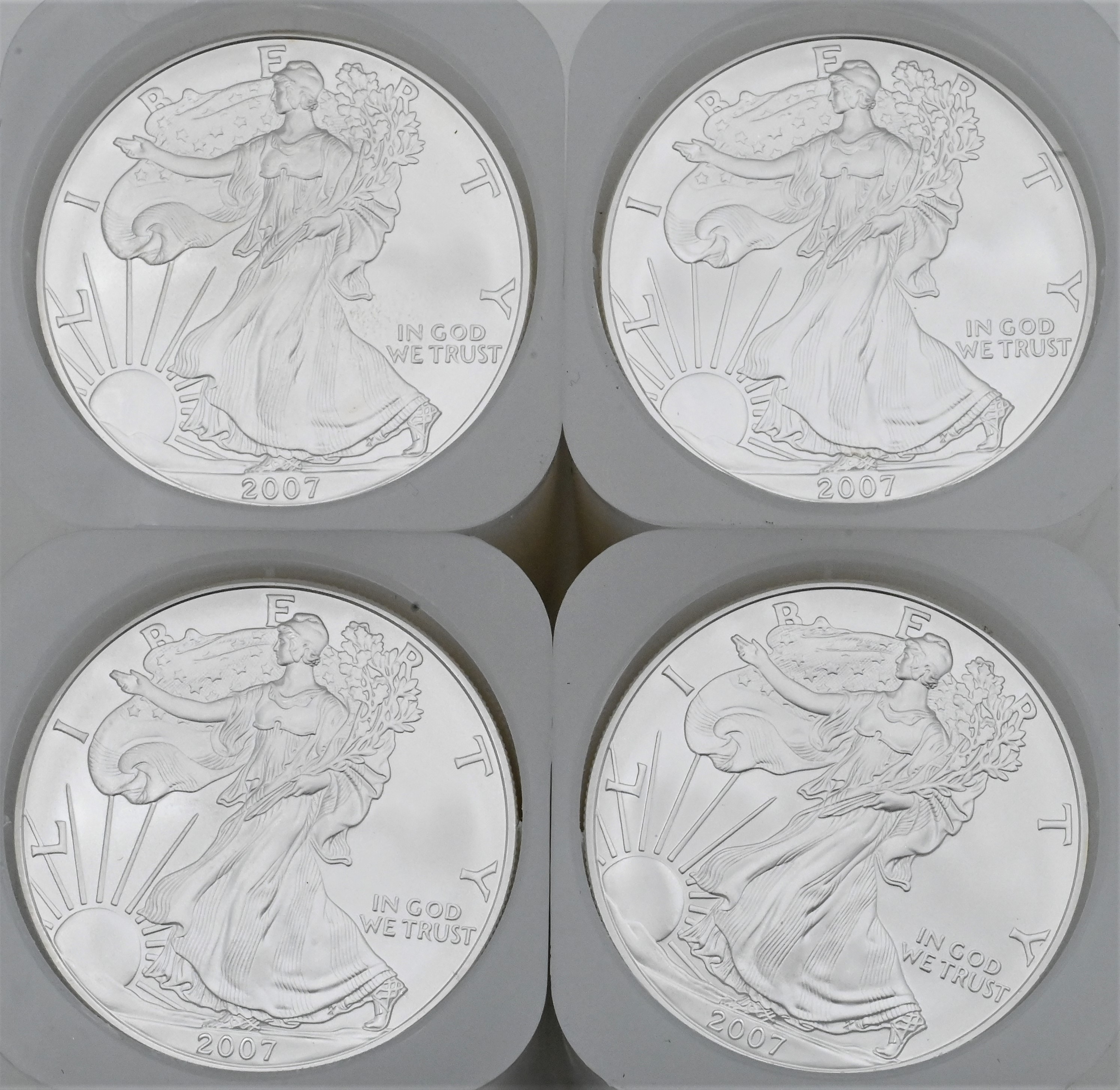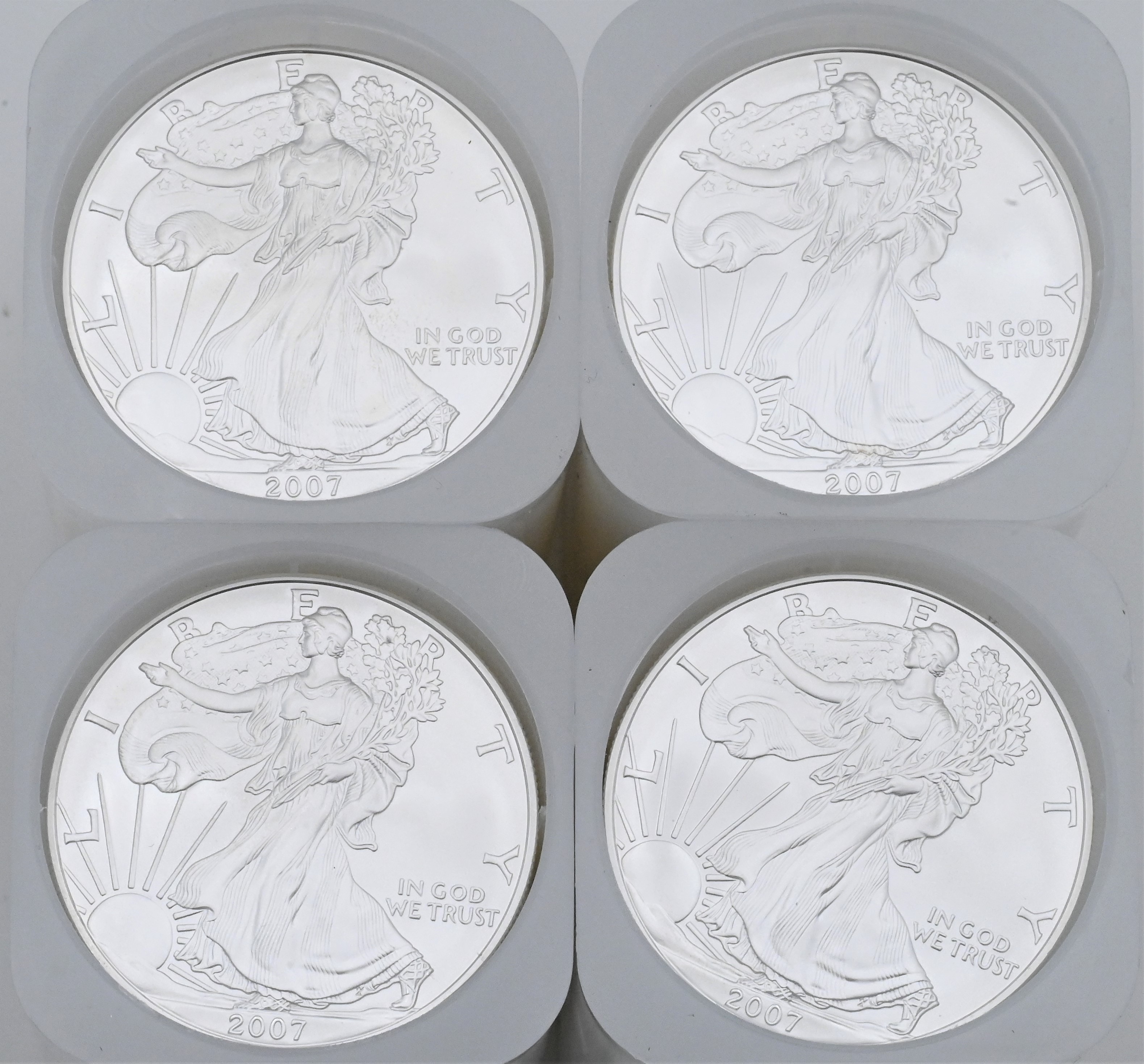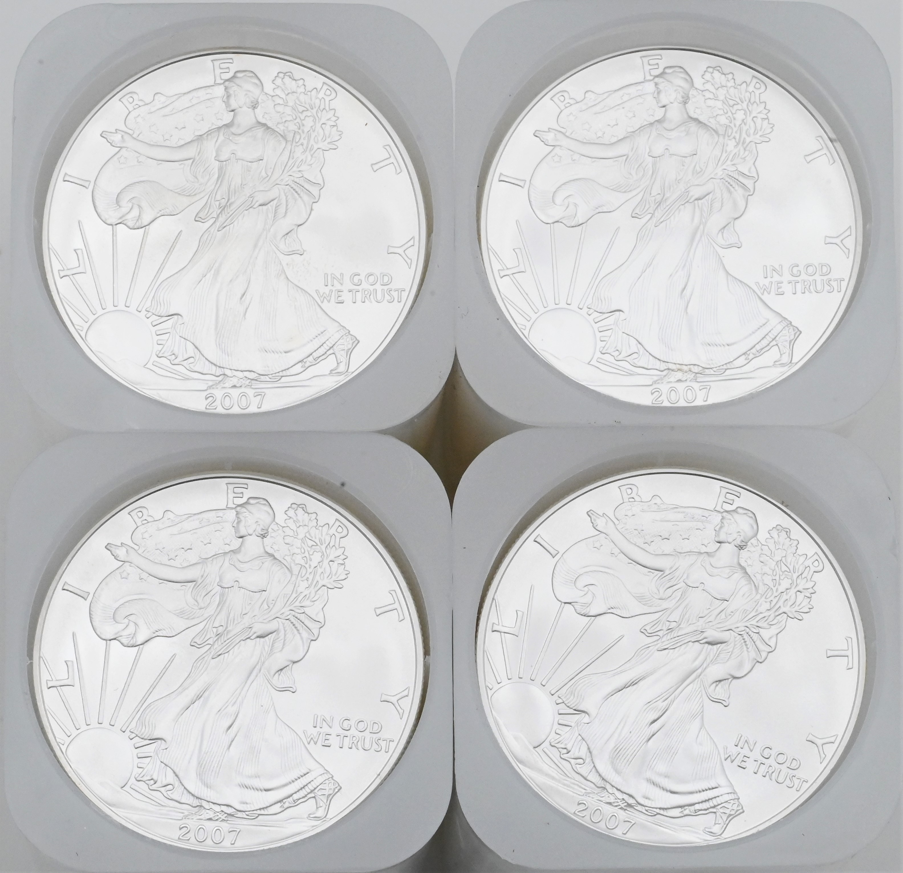 Four Rolls of 20-2007 1oz. Silver American Eagle Dollar Coins BU, composed of 1 troy ounce of .999 fine silver.