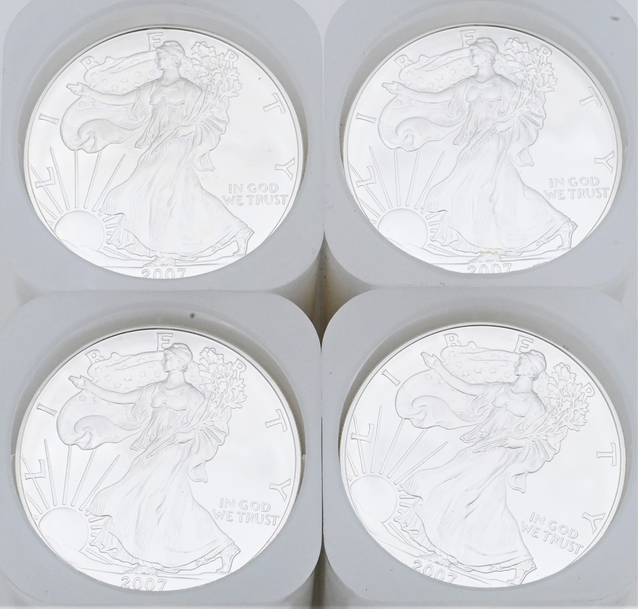 • Lot 197: Four Rolls of 20-2007 1oz Silver American Eagle Dollar Coins BU