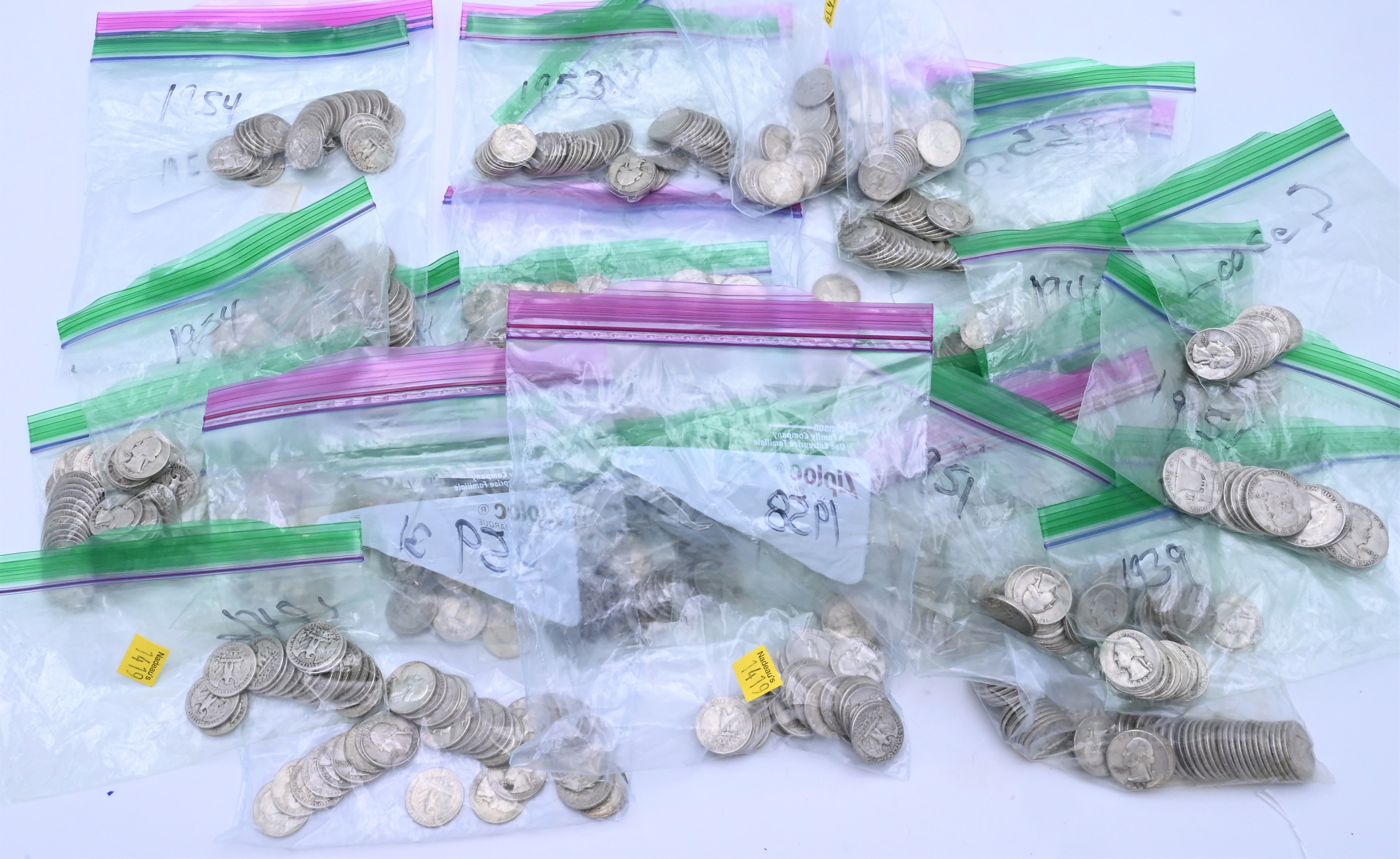 Large Group of Silver Quarters, all approximate counts of each year, 61-1963,27-1956,28-1958,52-1957,38-1961,33-1954,22-1951,38-1962,31-1959,37-1960,6-1934, 12-misc, 29-1948, 40-1952,11-1949,18-1946,14-1939,32-1945,42-1943,1-1932,29-1941,32-1944,10-1936,29-1950,13-1940,16-1941,9-1935,42-1953,37-1942,7-1938,1937,11-1955, 161 t.oz.