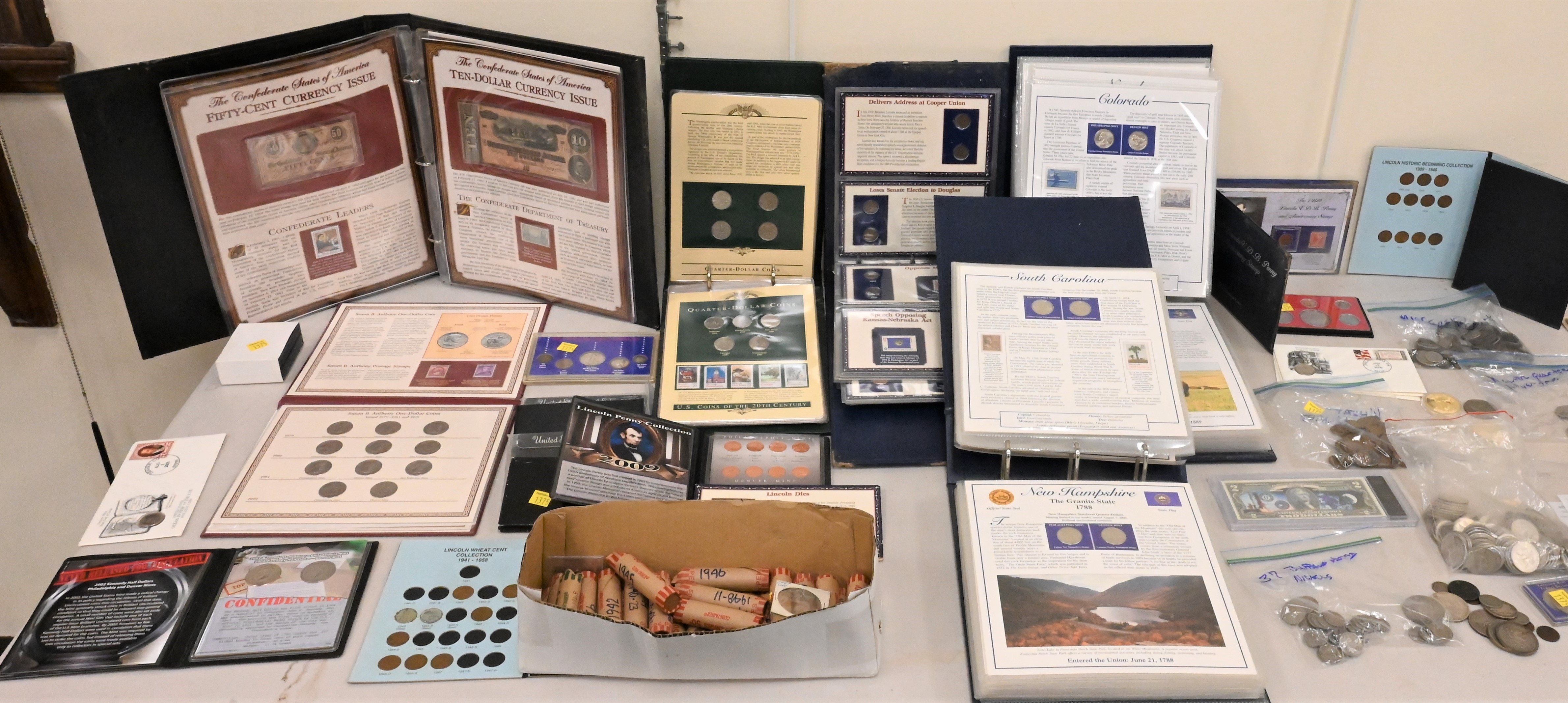 Large Group of Coins and Currency, to include U.S. coins of the 20th century, postal commemorative society with several silver coins, 100 years of Lincoln coins and stamps binder, two statehood quarters, collection postal commemorative society, first commemorative mints, currency of the confederate state of America with paper currency, silver dollars and half dollars etc.
