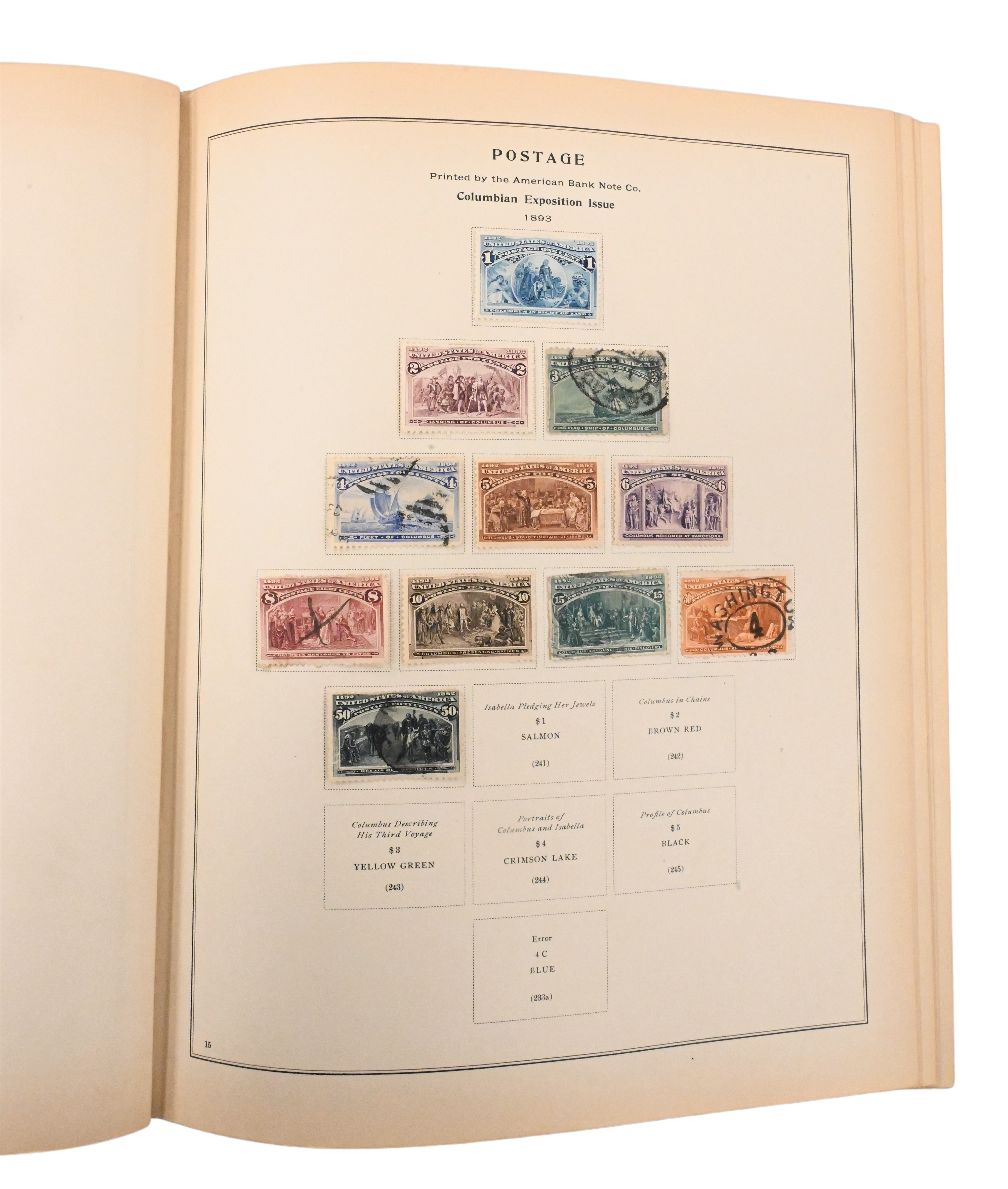 National Postage Stamp Album, containing a nice collection of mint and used United stamps, includes used set of Scott numbers 182-190, Columbians Scott numbers 230-240 mostly used, Scott number 311-313 used and manyback of the book including airnails, officials and revenues.