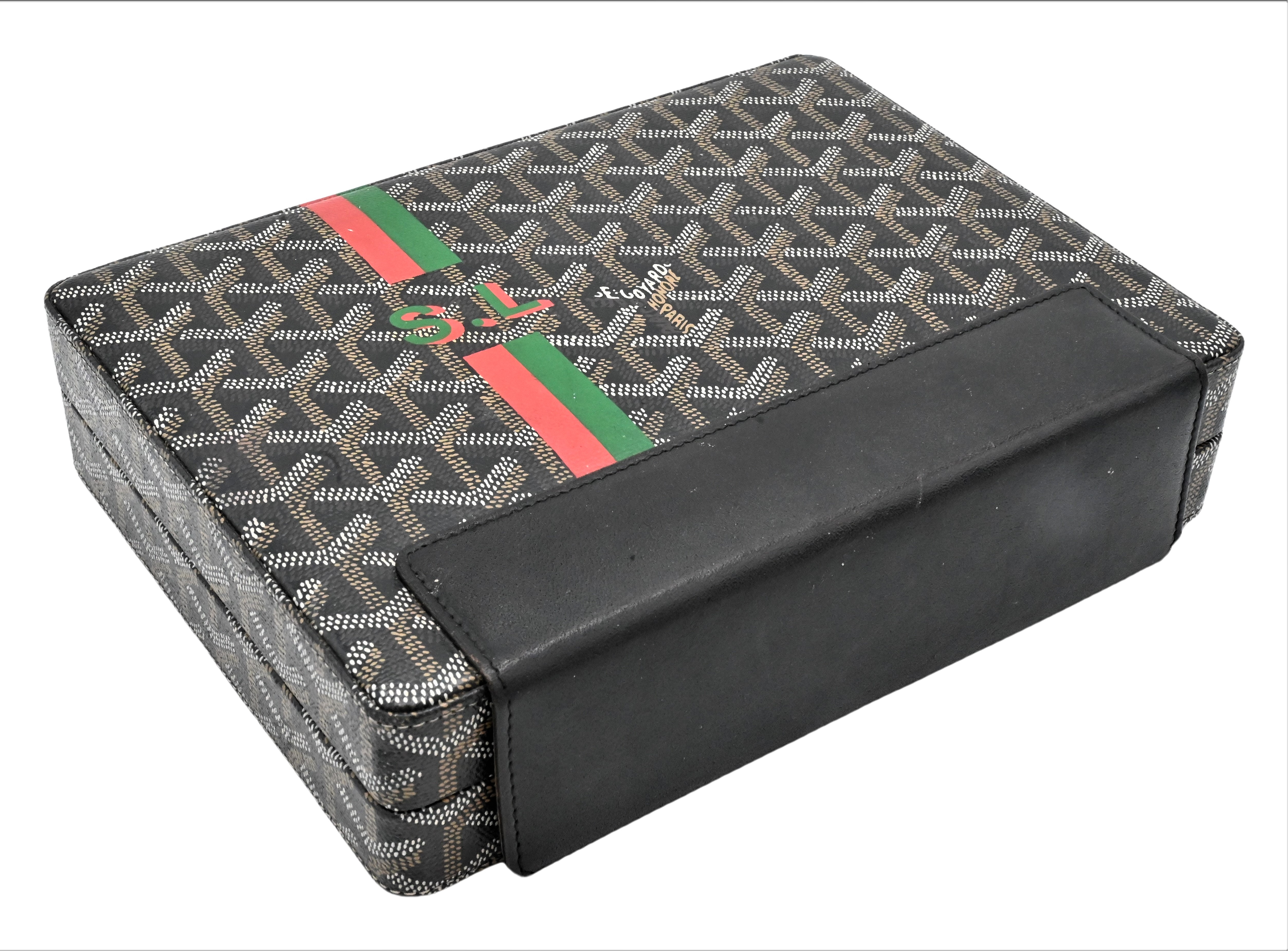 Custom Goyard Cigar Box, green and red stripe with initials S.L. marked, height 2 1/4 inches, width 9 3/8 inches.