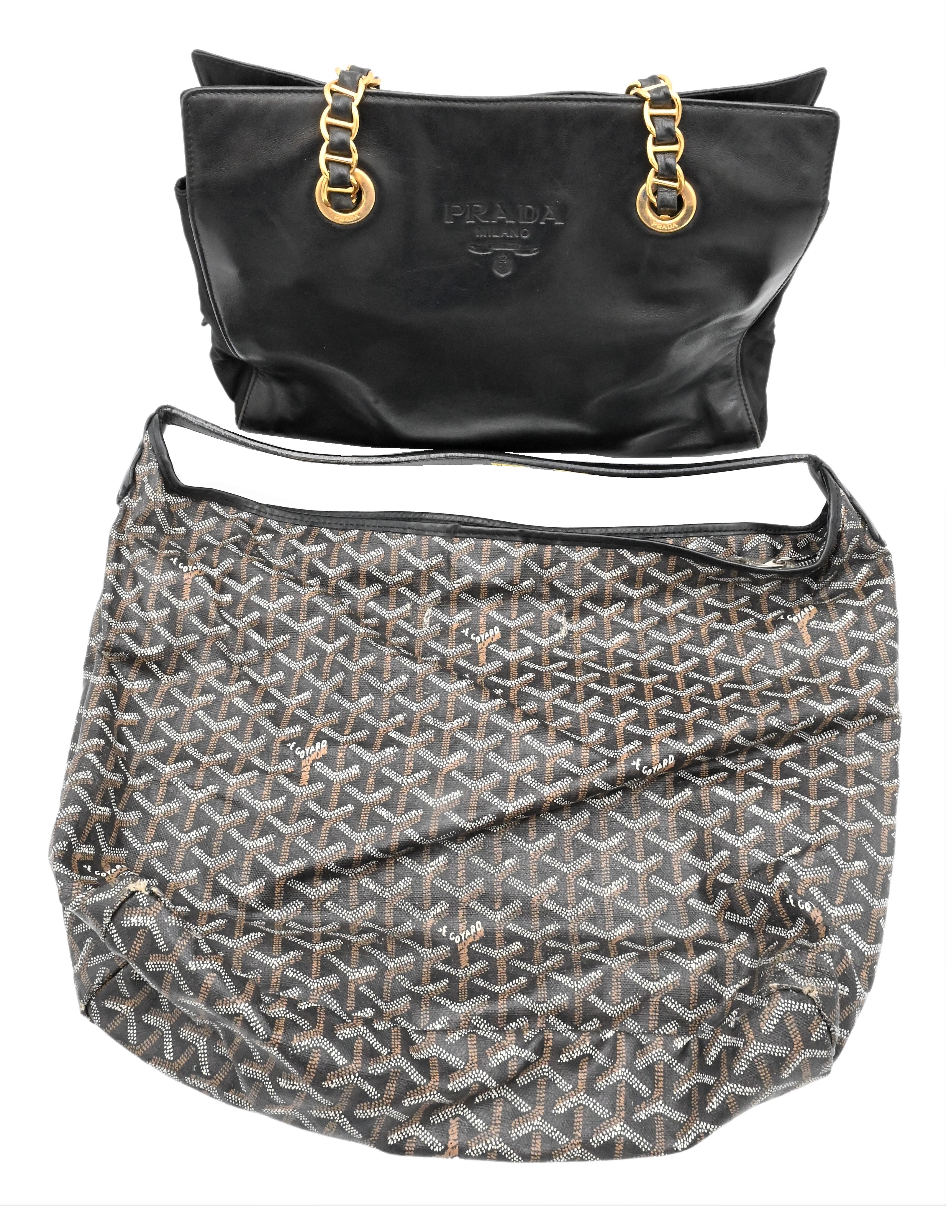 Two Leather Purses, to include Goyard handbag along with Prada bag marked “Prada Milano”, Goyard bag with small tears to bottom and corners.