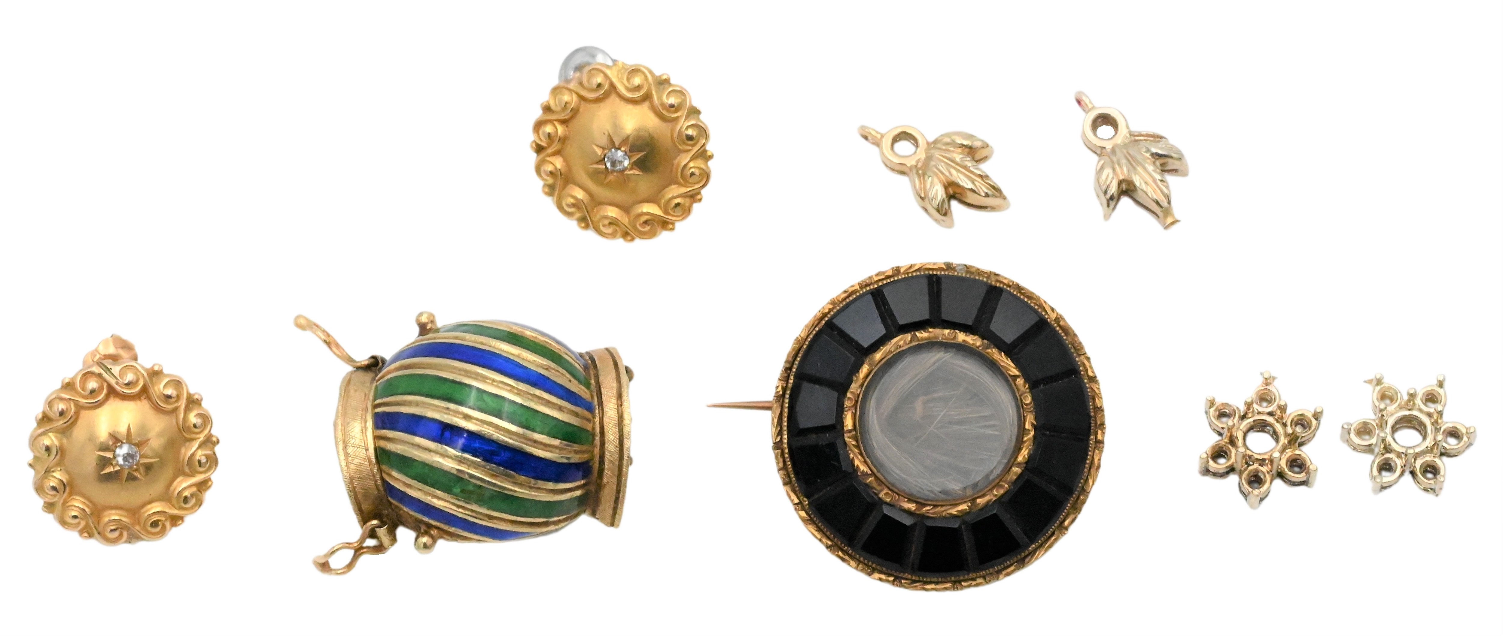 14 Karat Yellow Gold Lot, to include a pair of earrings, enameled clasp, Victorian pin, etc., 29. grams total weight.