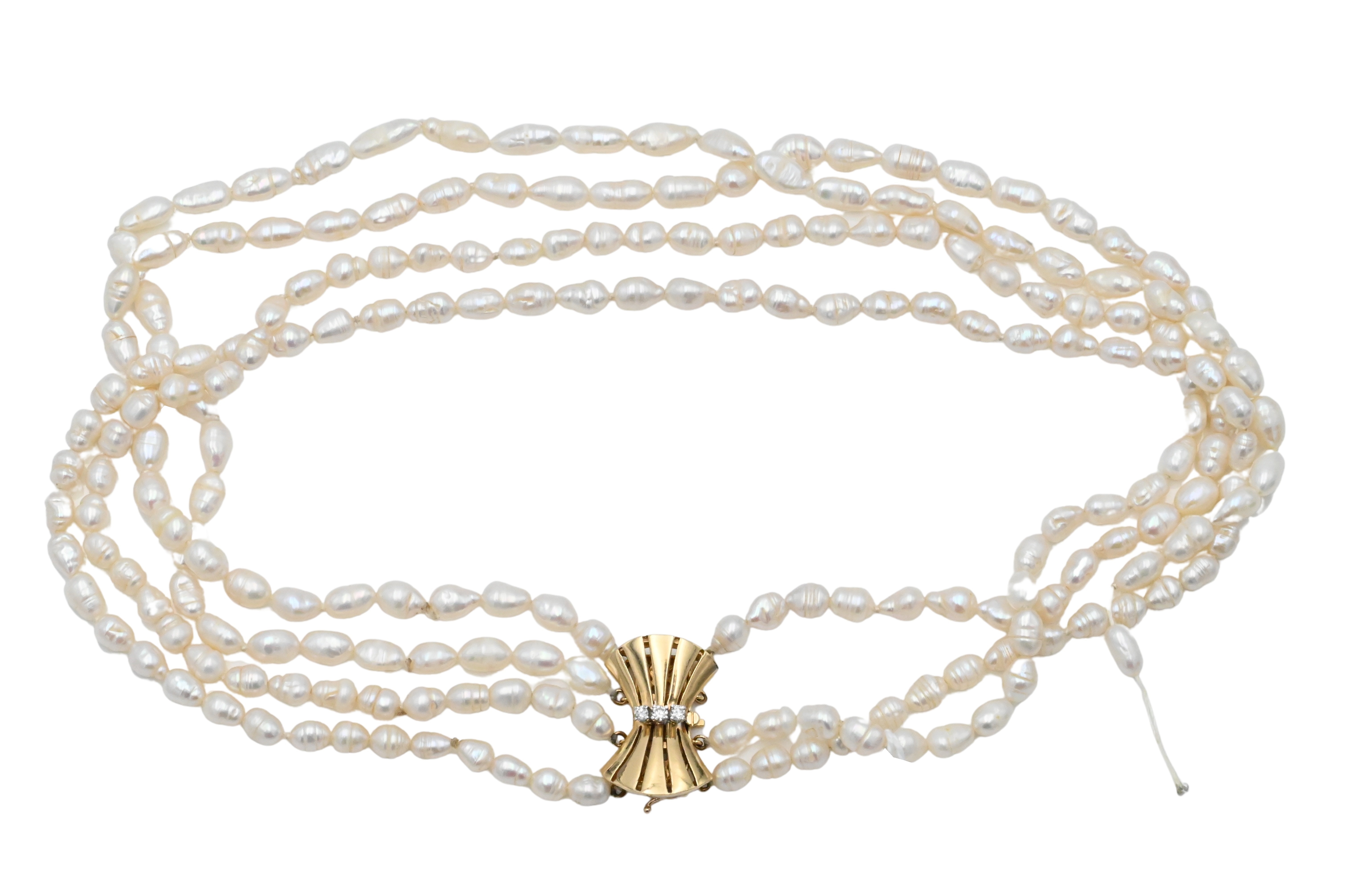 Triple Strand of Freshwater Pearls, along with a 14 Karat yellow gold clasp with three diamonds, length is 17 inches.