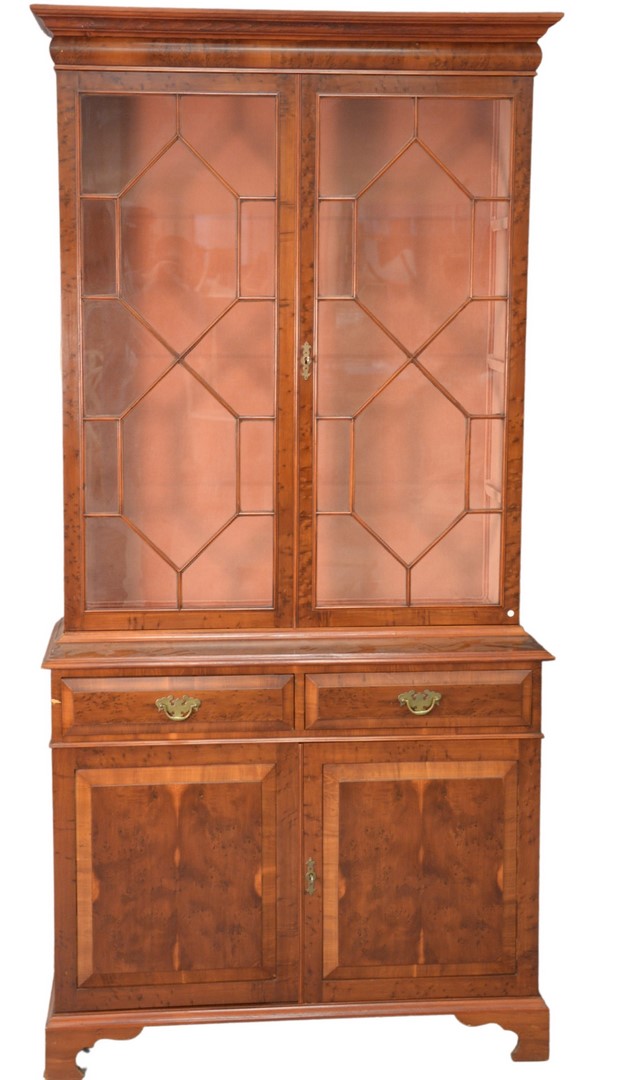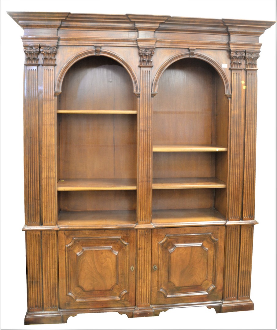Walnut Bookcase, with fluted pilaster ends, with open shelves and door to either end, height 86 inches, total length 72 inches, total depth 18 1/2 inches.
