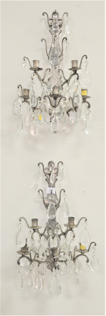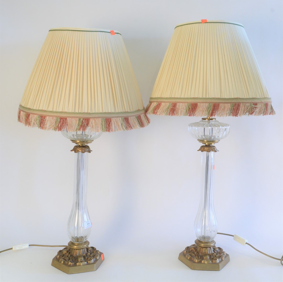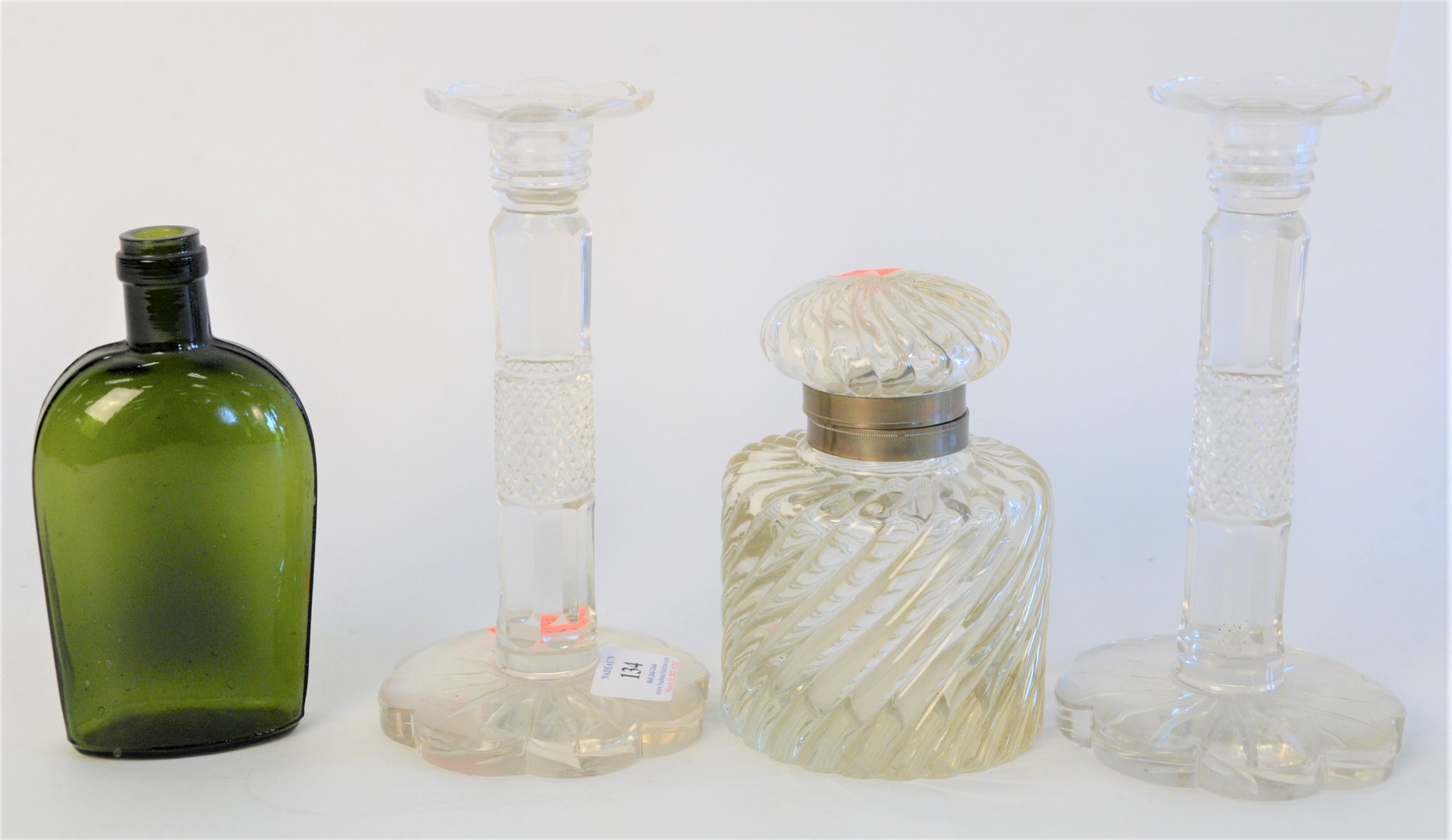 Four piece group to include a large French swirl crystal master inkwell, possibly Baccarat, along with 2 cut glass candlesticks height 8 inches, and a green glass bottle.