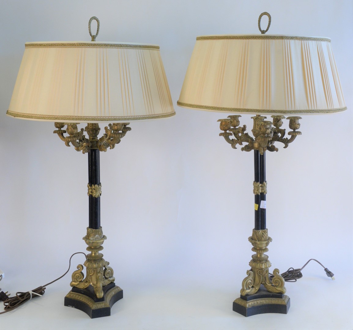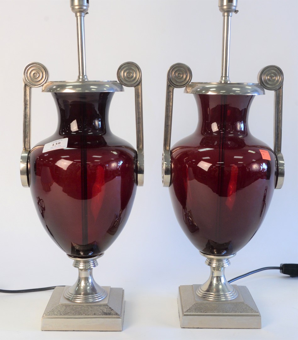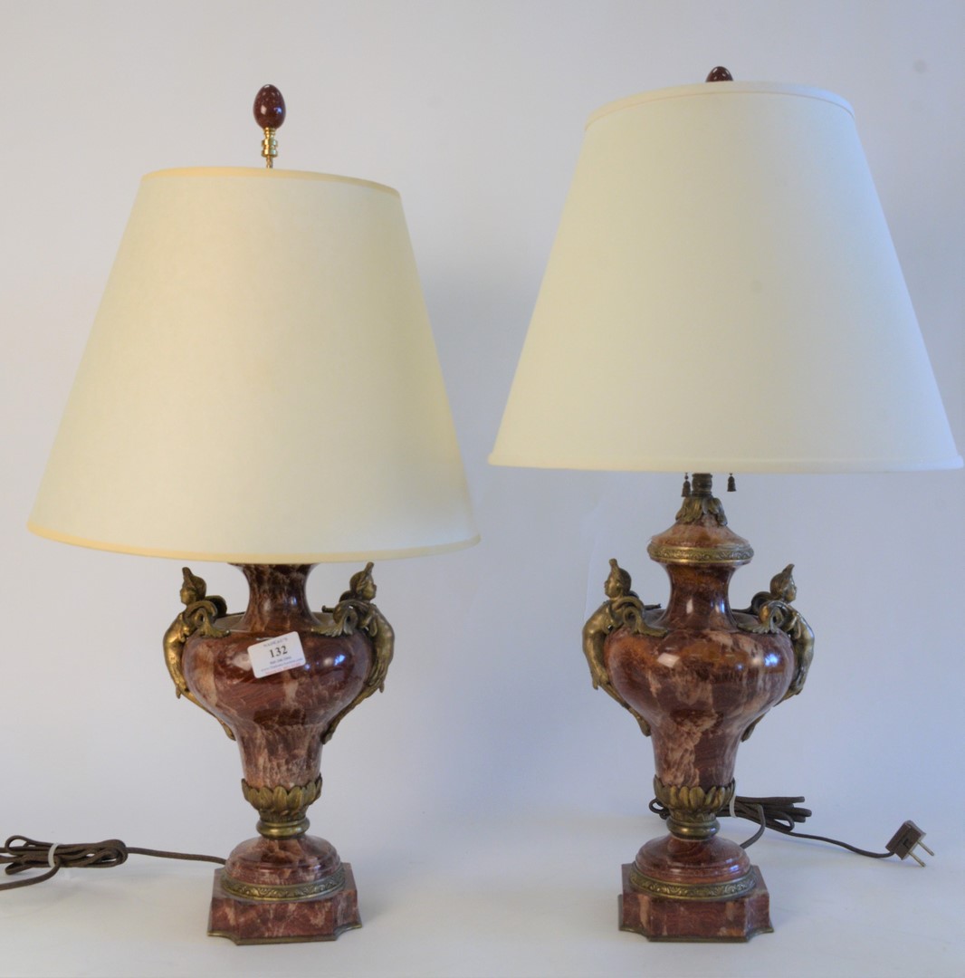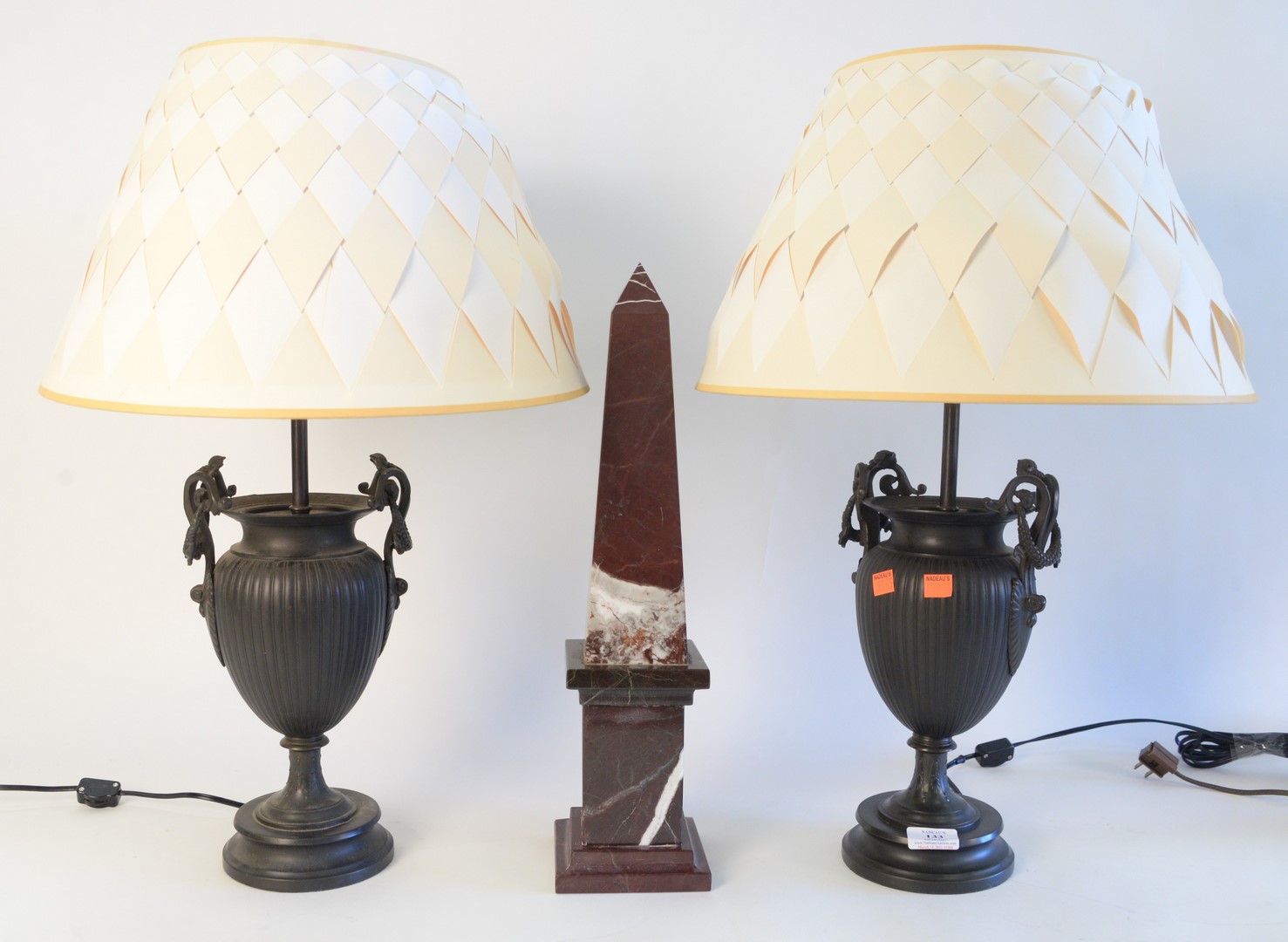 Three Piece Group, to include a pair of bronze urns with wreath handles, made into table lamps, height 12 1/2 inches along with a rouge marble obelisk, height 15 1/2 inches.