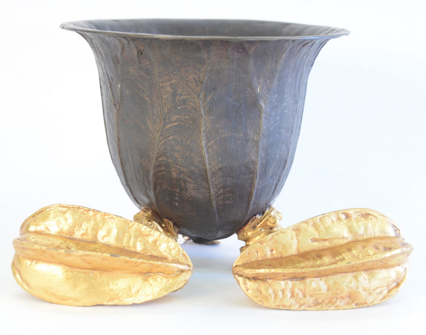 Three Bronze Pieces, to include bronze bowl with leaf form body and gilt frog feet, height 8 inches along with a pair of gilt bronze paperweights, in the form of gourds, length 5 1/2 inches.