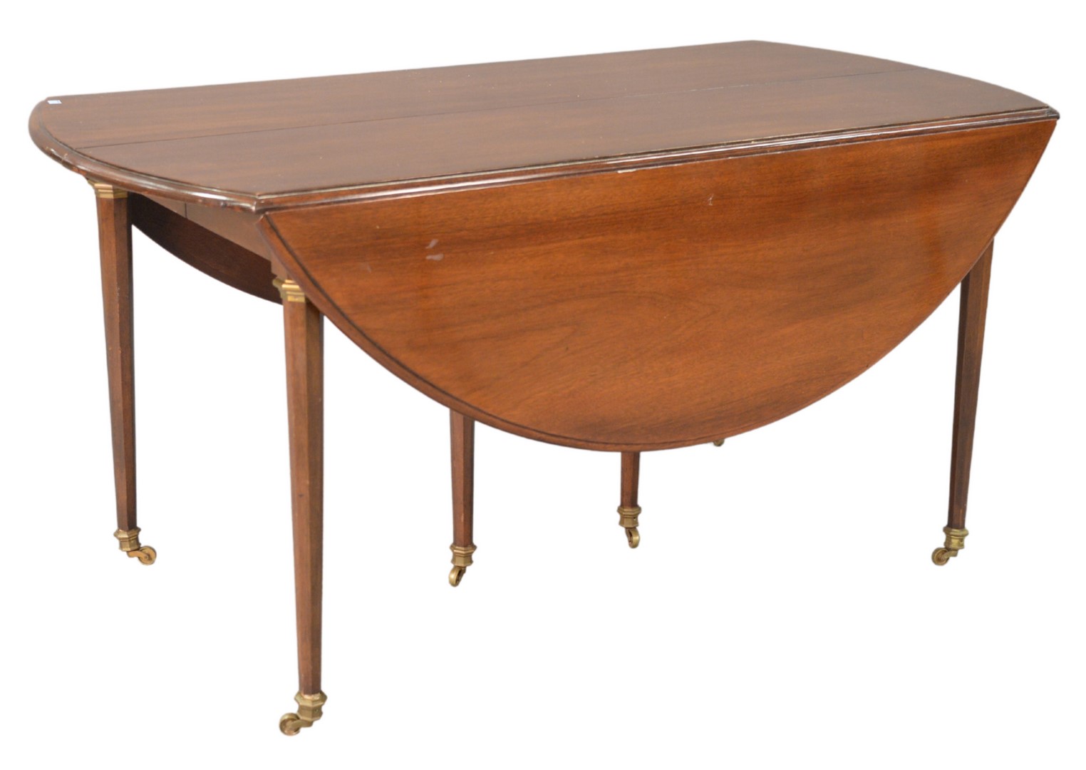 Continental Style Mahogany Extending Drop Leaf Table, in manner of Jansen, with two extra leaves, 24 inches each, height 29 inches, diameter 60 inches, open 60 x 108.