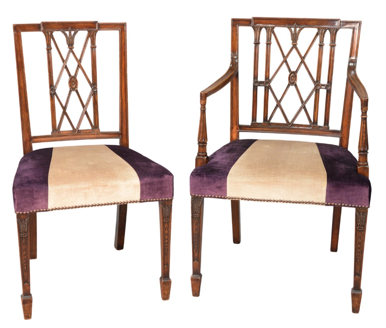 Set of Twelve Sheraton Style Dining Chairs, with fully upholstered seats. Provenance: Eight sold at Christie’s, South Kensington, June 7, 2000 4 made to match later, Joanna Trading to present owner height 35 1/2 inches.