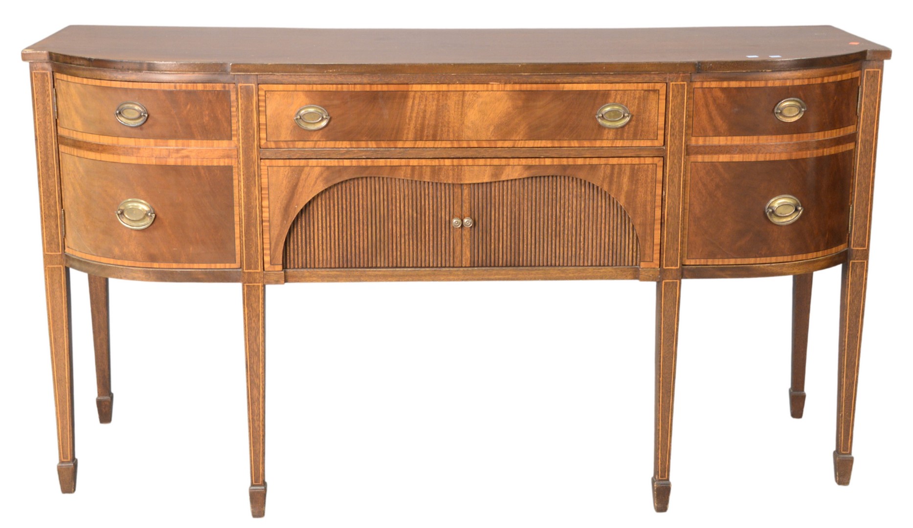 Mahogany Federal Style Sideboard, with banded inlaid front drawers and doors, one small chip of veneer on top left, height 37 1/2 inches, width 68 inches.