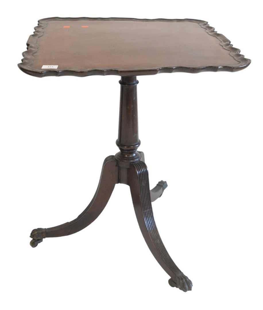 George II Mahogany Piecrust Tip Table, on turned shaft, on reeded downswept members, ending in brass paw feet, with 18th Century, height 28 inches, top 23 1/2 x 24.
