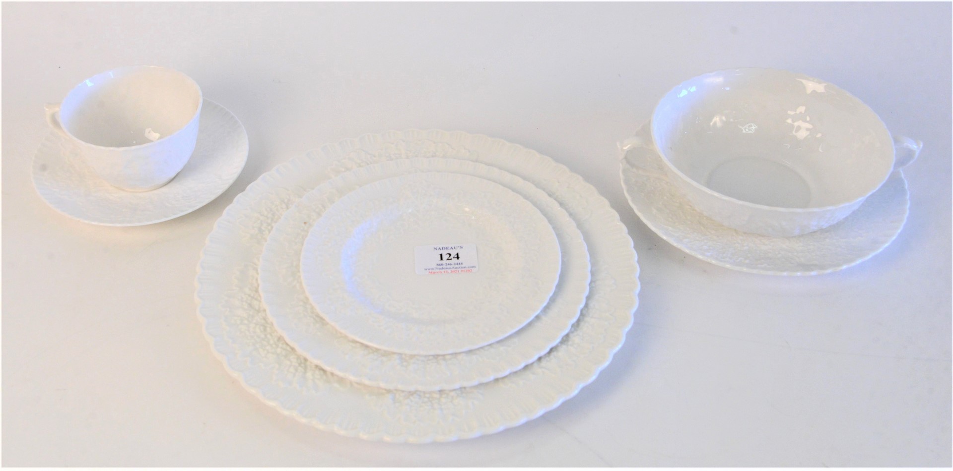 Spode Porcelain 135 Piece Dinnerware Set, pattern ‘Savoy White,’ to include 33 dinner plates, 10 tea cups, 16 soup bowls, along with several other pieces, diameter 10-1/2 inches dinner plate.
