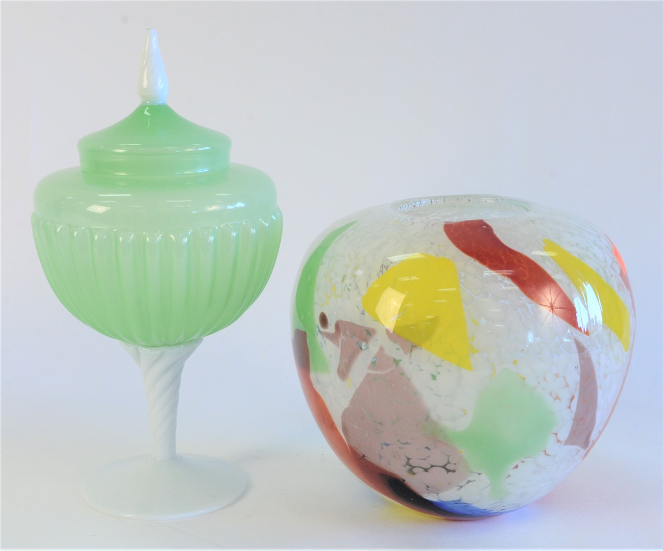 Eight Piece Art Glass Lot, to include a yellow and purple Venetian compote a green opaline style covered compote a red glass bell a glass hanging planter along with a Murano blown glass vase, etc tallest 13 inches.