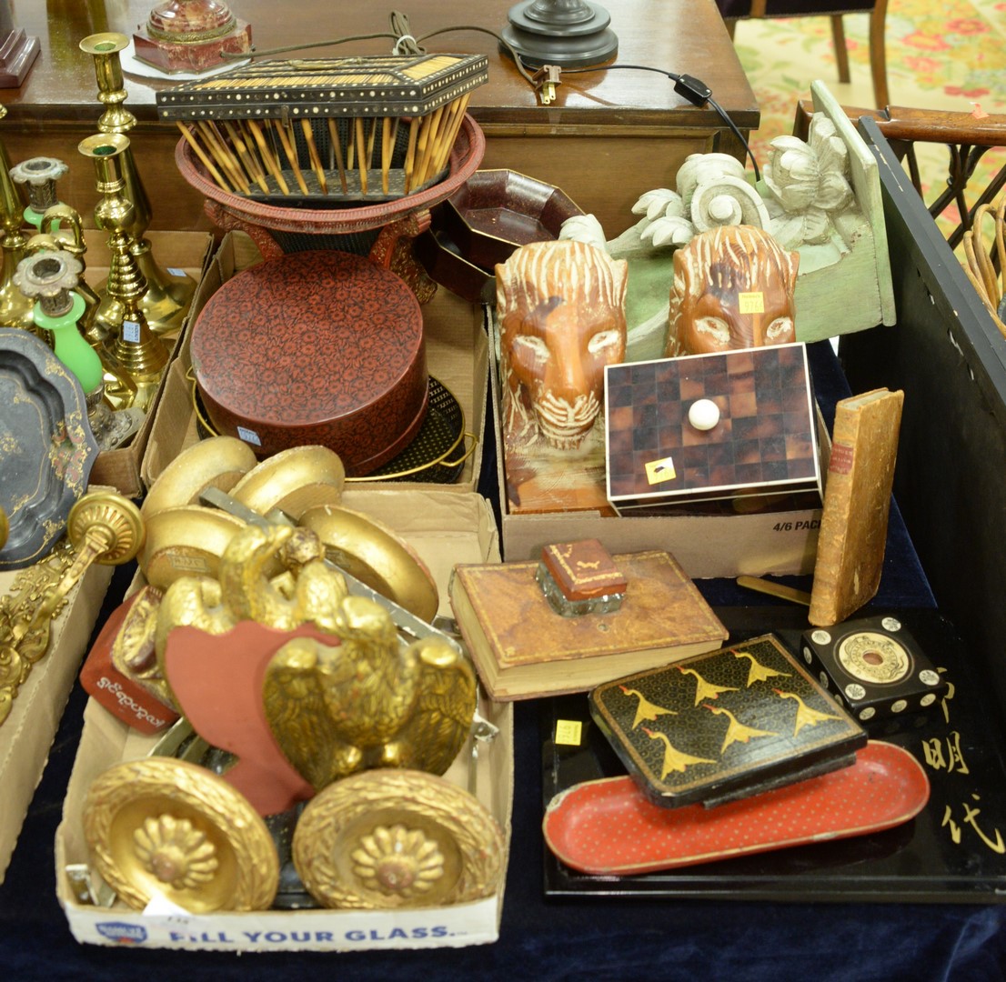 Three Tray Lots, to include gilt ceramic eagle bookends carved wood lion bookends 6 gilt wood tie backs an inkwell in the form of a book along with a painted and carved wooden shelf.