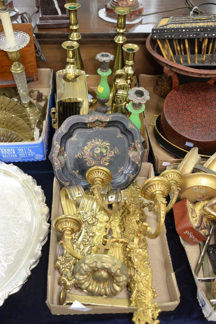 Three Tray Lots, to include pair of Colonial Williamsburg brass bookends, pair of brass push-up candlesticks, silvered book, candle sconces, pair of brass pig banks.